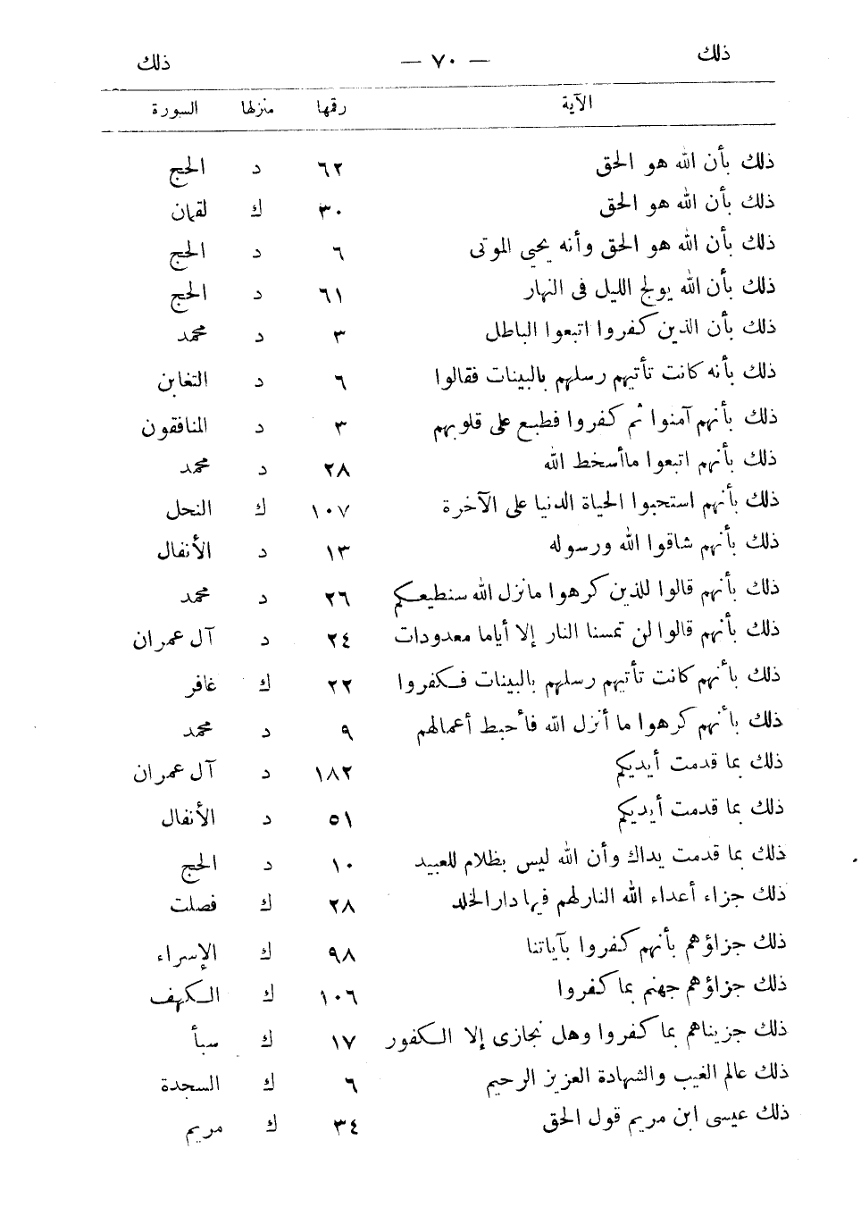 ذلك بأن الله يولج الليل في النهار 61 د الحج ذلك بأن الذين كفروا اتبعوا الباطل 3 د محمد ذلك بأنه كانت تأتيهم رسلهم بالبينات فقالوا 6 د التغابن ذلك بأنهم آمنوا ثم كفروا فطبع الله على قلوبهم 3 د المنافقون ذلك بأنهم اتبعوا ما أسخط الله 28 د محمد ذلك بأنهم استحبوا الحياة الدنيا على الآخرة 107 ك النحل ذلك بأنهم شاقوا الله ورسوله 13 د الأنفال ذلك بأنهم شاقوا الله ورسوله 4 د الحشر ذلك بأنهم قالوا للذين كرهوا ما نزل الله سنطيعكم 26 د محمد ذلك بأنهم قالوا لن تمسنا النار إلا أياما معدودات 24 د آل عمران ذلك بأنهم كانت تأتيهم رسلهم بالبينات فكفروا 22 ك غافر ذلك بأنهم كرهوا ما أنزل الله فأحبط أعمالهم 9 د محمد ذلك بما قدمت أيديكم 182 د آل عمران ذلك بما قدمت أيديكم 51 د الأنفال ذلك بما قدمت يداك وأن الله ليس بظلام للعبيد 10 د الحج ذلك جزاء أعداء الله النار لهم فيها دار الخلد 28 ك فصلت ذلك جزاؤهم بأنهم كفروا بآياتنا 98 ك الإسراء ذلك جزاؤهم جهنم بما كفروا 106 ك الكهف ذلك جزيناهم بما كفروا وهل نجازي إلا الكفور 17 ك سبأ ذلك عالم الغيب والشهادة العزيز الرحيم 6 ك السجدة ذلك عيسى ابن مريم قول الحق 34 ك مريم