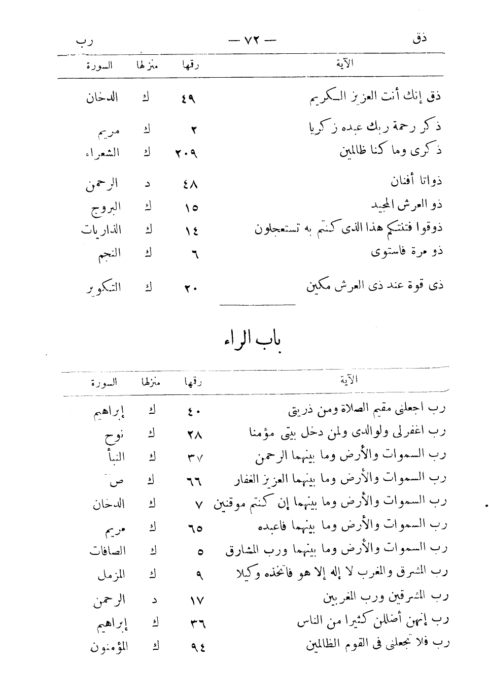 باب الراء رب اجعلني مقيم الصلاة ومن ذريتي 40 ك إبراهيم رب اغفر لي ولوالدي ولمن دخل بيتي مؤمنا 28 ك نوح رب السموات والأرض وما بينهما الرحمن 37 ك النبأ رب السموات والأرض وما بينهما العزيز الغفار 66 ك ص رب السموات والأرض وما بينهما إن كنتم موقنين 7 ك الدخان رب السموات والأرض وما بينهما فاعبده 65 ك مريم رب السموات والأرض وما بينهما ورب المشارق 5 ك الصافات رب المشرق والمغرب لا إله إلا هو فاتخذه وكيلا 9 ك المزمل رب المشرقين ورب المغربين 17 د الرحمن رب إنهن أضللن كثيرا من الناس 36 ك إبراهيم رب فلا تجعلني في القوم الظالمين 94 ك المؤمنون
