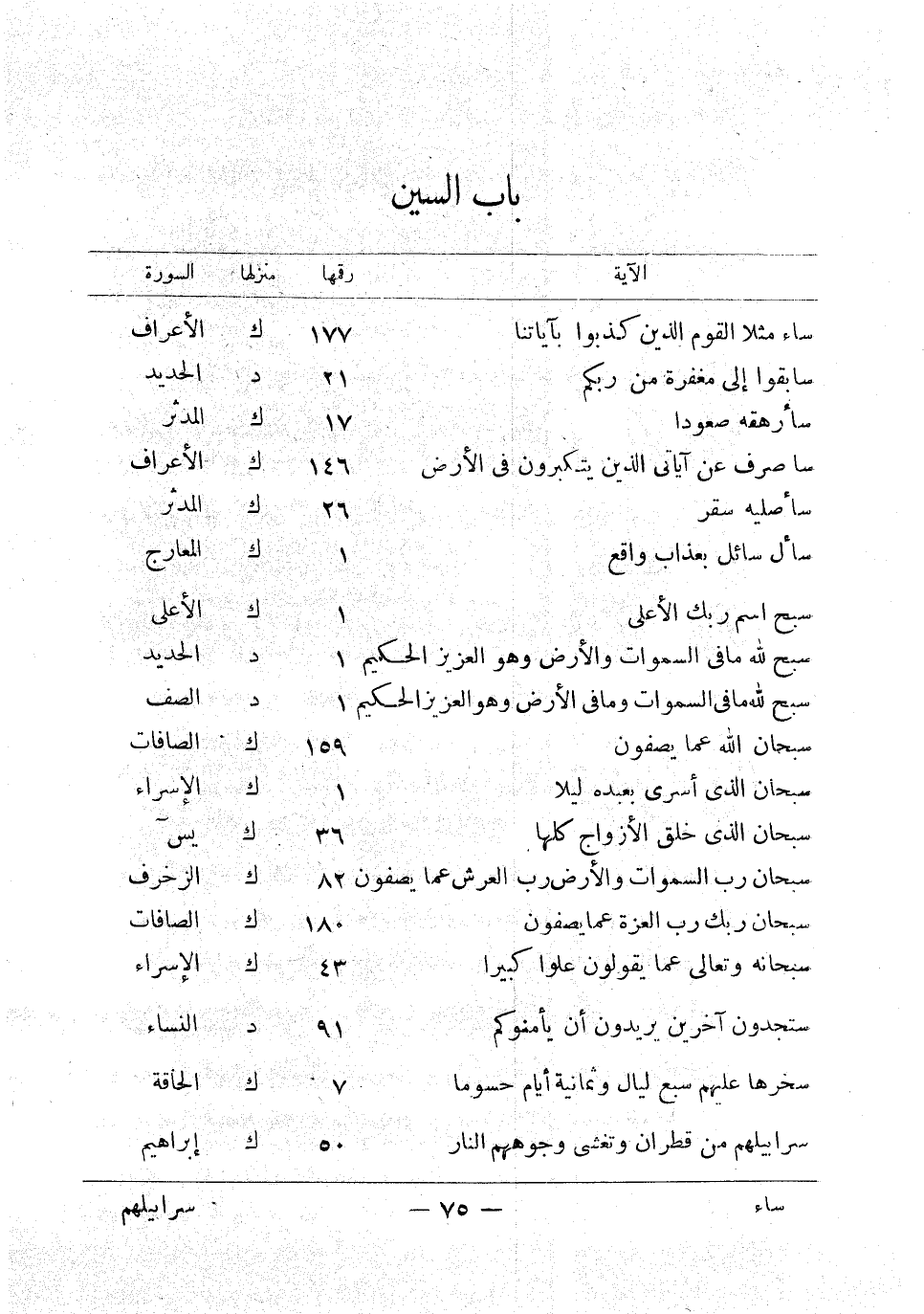 ساء مثلا القوم الذين كذبوا بآياتنا 177 ك الأعراف سابقوا إلى مغفرة من ربكم 21 د الحديد سأرهقه صعودا 17 ك المدثر سأصرف عن آياتي الذين يتكبرون في الأرض 146 ك الأعراف سأصليه سقر 26 ك المدثر سأل سائل بعذاب واقع 1 ك المعارج سبح اسم ربك الأعلى 1 ك الأعلى سبح لله ما في السموات والأرض وهو العزيز الحكيم 1 د الحديد سبح لله ما في السموات 1 د الحشر سبح لله ما في السموات والأرض وهو العزيز الحكيم 1 د الصف سبحان الله عما يصفون 159 ك الصافات سبحا الذي أسرى بعبده ليلا 1 ك الإسراء سبحان الذي خلق الأزواج كلها 36 ك يس سبحان رب السموات والأرض رب العرش عما يصفون 82 ك الزخرف سبحان ربك رب العزة عما يصفون 180 ك الصافات سبحانه وتعالى عما يقولون علوا كبيرا 43 ك الإسراء ستجدون آخرين يريدون أن يأمنوكم 91 د النساء سخرها عليهم سبع ليال وثمانية أيام حسوما 7 ك الحاقة سرابيلهم من قطران وتغشى وجوههم النار 50 ك إبراهيم