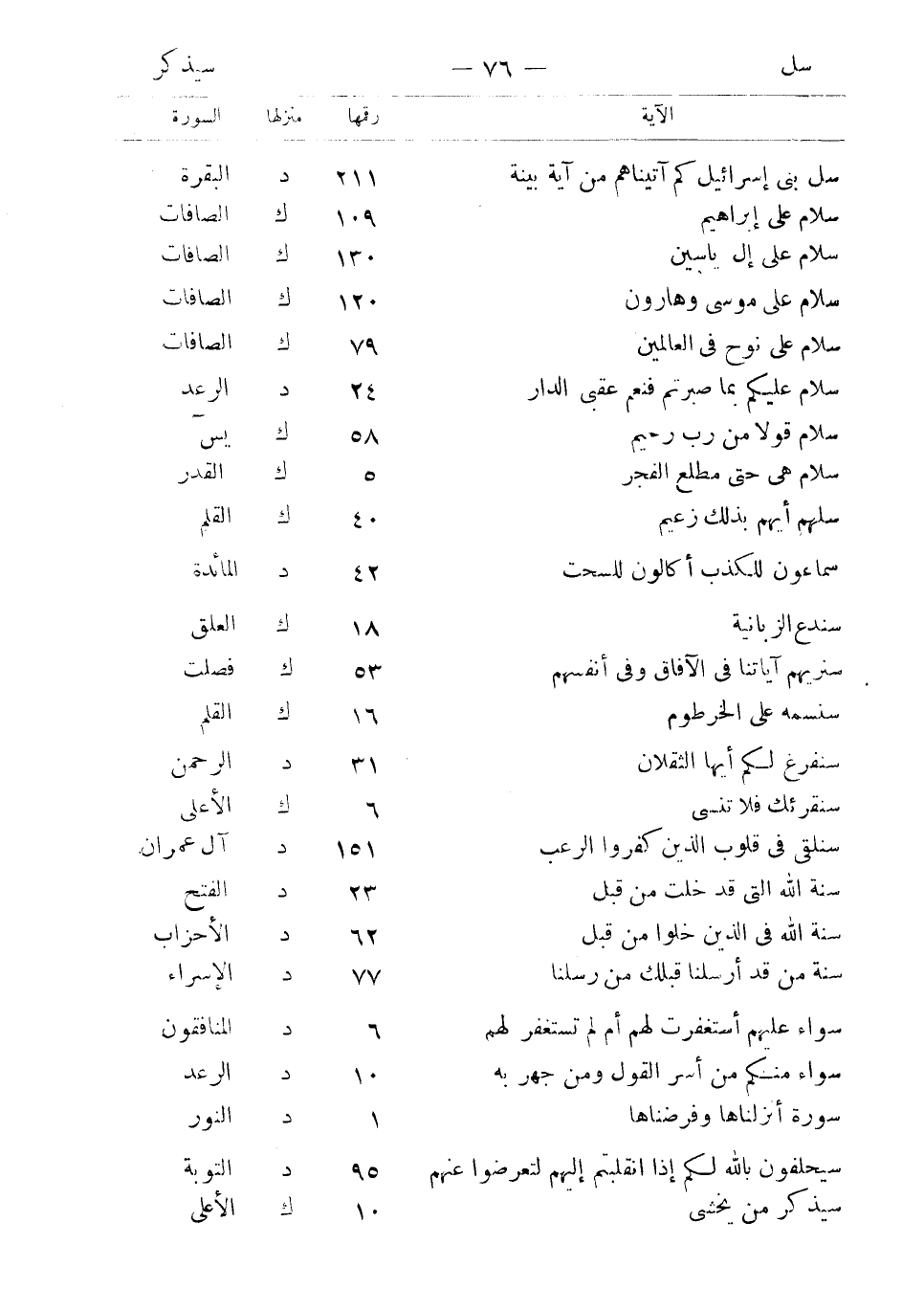 سلام على إل ياسين 130 ك الصافات سلام على موسى وهارون 120 ك الصافات سلام على نوح في العالمين 79 ك الصافات سلام عليكم بما صبرتم فنعم عقبى الدار 24 د الرعد سلام قولا من رب رحيم 58 ك يس سلام هي حتى مطلع الفجر 5 ك القدر سلهم أيهم بذلك زعيم 40 ك القلم سماعون للكذب أكالون للسحت 42 د المائدة سندع الزبانية 18 ك العلق سنريهم آياتنا في الآفاق وفي أنفسهم 53 ك فصلت سنسمه على الخرطوم 16 ك القلم سنفرغ لكم أيها الثقلان 31 د الرحمن سنقرئك فلا تنسى 6 ك الأعلى سنلقي في قلوب الذين كفروا الرعب 151 د آل عمران سنة الله التي قد خلت من قبل 23 د الفتح سنة الله في الذين خلوا من قبل 62 د الأحزاب سنة من قد أرسلنا من قبلك من رسلنا 77 د الإسراء سواء عليهم أستغفرت لهم أم لم تستغفر لهم 6 د المنافقون سواء منكم من أسر القول ومن جهر به 10 د الرعد سورة أنزلناها وفرضناها 1 د النور سيحلفون بالله لكم إذا انقلبتم إليهم لتعرضوا عنهم 95 د التوبة سيذكر من يخشى 10 ك الأعلى