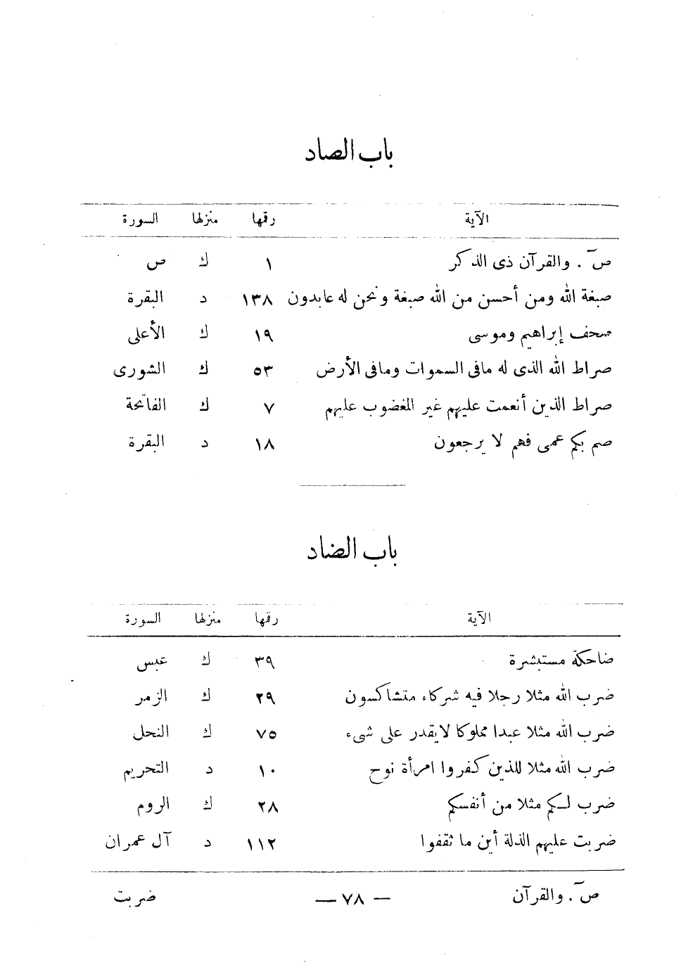صراط الله الذي له ما في السموات وما في الأرض 53 ك الشورى صراط الذين أنعمت عليهم غير المغضوب عليهم 7 ك الفاتحة صم بكم عمي فهم لا يرجعون 18 د البقرة باب الضاد ضاحكة مستبشرة 39 ك عبس ضرب الله مثلا رجلا فيه شركاء متشاكسون 29 ك الزمر ضرب الله مثلا عبدا مملوكا لا يقدر على شئ 75 ك النحل ضرب الله مثلا للذين كفروا امرأة نوح 10 د التحريم ضرب لكم مثلا من أنفسكم 28 ك الروم ضربت عليهم الذلة أين ما ثقفوا 112 د آل عمران