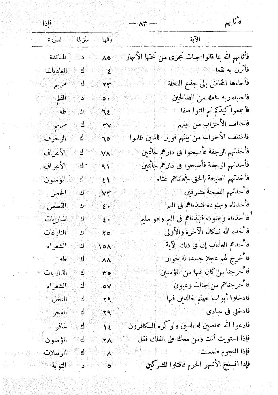 فأخرجنا من كان فيها من المؤمنين 35 ك الذاريات فأخرجناهم من جنات وعيون 57 ك الشعراء فادخلوا أبواب جهنم خالدين فيها 29 ك النحل فادخلي في عبادي 29 ك الفجر فادعوا الله مخلصين له الدين ولو كره الكافرون 14 ك غافر فإذا استويت أنت ومن معك على الفلك فقل 28 ك المؤمنون فإذا النجوم طمست 8 ك المرسلات فإذا انسلخ الأشهر الحرم فاقتلوا المشركين 5 د التوبة