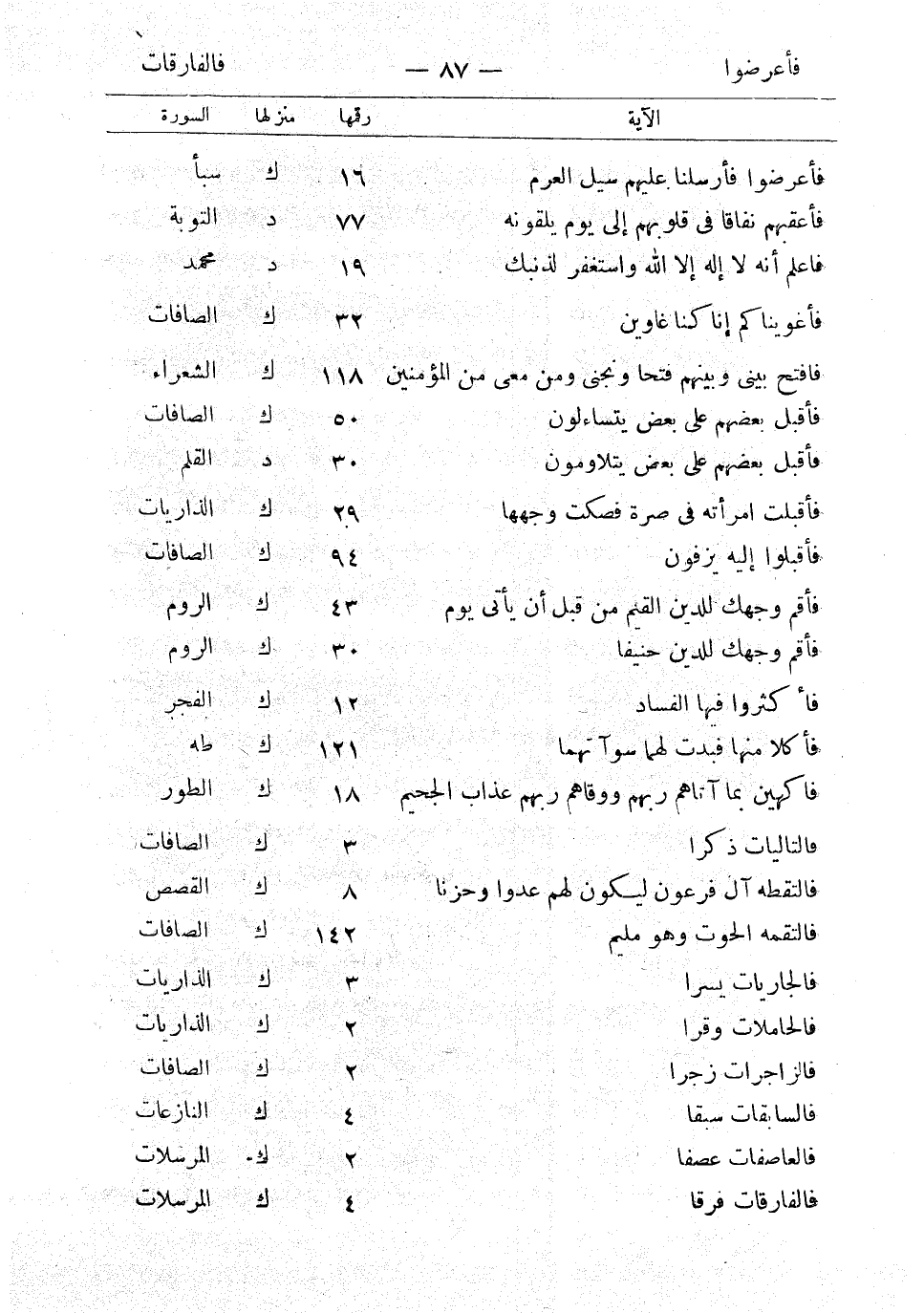 فأغويناكم إنا كنا غاوين 32 ك الصافات فافتح بيننا وبينهم فتحا ونجني ومن معي من المؤمنين 118 ك الشعراء فأقبل بعضهم على بعض يتساءلون 50 ك الصافات فأقبل بعضهم على بعض يتلاومون 30 د القلم فأقبلت امرأته في صرة فصكت وجهها 29 ك الذاريات فأقبلوا إليه يزفون 94 ك الصافات فأقم وجهك للدين القيم من قبل أن يأتي يوم 43 ك الروم فأقم وجهك للدين حنيفا 30 ك الروم فأكثروا فيها الفساد 12 ك الفجر فأكلا منها فبدت لهما سوآتهما 121 ك طه فاكهين بما آتاهم ربهم ووقاهم ربهم عذاب الجحيم 18 ك الطور فالتاليات ذكرا 3 ك الصافات فالتقطه آل فرعون ليكون لهم عدوا وحزنا 8 ك القصص فالتقمه الحوت وهو مليم 142 ك الصافات فالجاريات يسرا 3 ك الذاريات فالحاملات وقرا 2 ك الذاريات فالزاجرات زجرا 2 ك الصافات فالسابقات سبقا 4 ك النازعات فالعاصفات عصفا 2 ك المرسلات فالفارقات فرقا 4 ك المرسلات