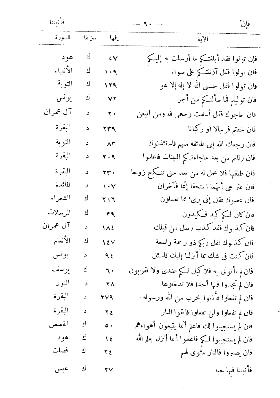 فإن تولوا فقد أبلغتكم ما أرسلت به إليكم 57 ك هود فإن تولوا فقد آذنتكم على سواء 109 ك الأنبياء فإن تولوا فقل حسبي الله لا إله إلا هو 129 ك التوبة فإن توليتم فما سألتكم من أجر 72 ك يونس فإن حاجوك فقل أسلمت وجهي لله ومن اتبعن 20 د آل عمران فإن خفتم فرجالا أو ركبانا 239 د البقرة فإن رجعك الله إلى طائفة منهم فاستأذنوك 83 د التوبة فإن زللتم من بعد ما جاءتكم البينات فاعلموا 209 د البقرة فإن طلقها فلا تحل له من بعد حتى تنكح زوجا 230 د البقرة فإن عثر على أنهما استحقا إثما فآخران 107 د المائدة فإن عصوك فقل إني برئ مما تعملون 216 ك الشعراء فإن كان لكم كيد فكيدون 39 ك المرسلات فإن كذبوك فقد كذب رسل من قبلك 184 د آل عمران فإن كذبوك فقل ربكم ذو رحمة واسعة 147 ك الأنعام فإن كنت في شك مما أنزلنا إليك فاسئل 94 د يونس فإن لم تأتوني به فلا كيل لكم عندي ولا تقربون 60 ك يوسف فإن لم تجدوا فيها أحدا فلا تدخلوها 28 د النور