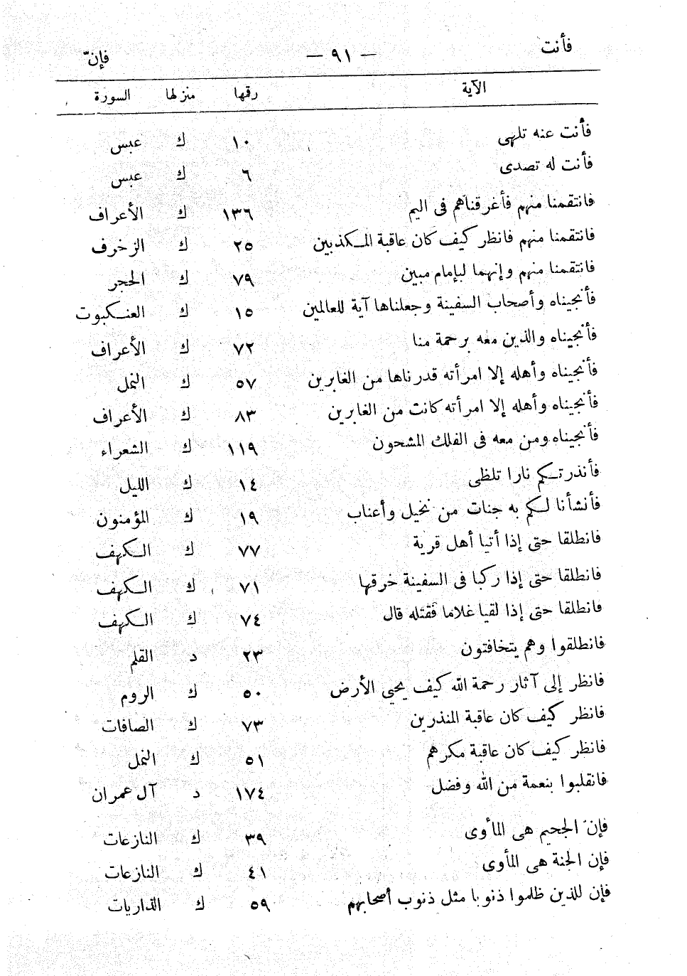 فأنت عنه تلهى 10 ك عبس فأنت له تصدى 6 ك عبس فانتقمنا منهم فأغرقناهم في اليم 136 ك الأعراف فانتقمنا منهم فانظر كيف كان عاقبة المكذبين 25 ك الزخرف فانتقمنا منهم وإنهما لبإمام مبين 79 الحجر فأنجيناه وأصحاب السفينة وجعلناها آية للعالمين 15 ك العنكبوت فأنجيناه والذين معه برحمة منا 72 ك الأعراف فإنجيناه وأهله إلا امرأته قدرناها من الغابرين 57 ك النمل فأنجيناه وأهله إلا امرأته كانت من الغابرين 83 ك الأعراف فأنجيناه ومن معه في الفلك المشحون 119 ك الشعراء فأنذرتكم نارا تلظى 14 ك الليل فأنشأنا لكم به جنات من نخيل وأعناب 19 ك المؤمنون فانطلقا حتى أتيا أهل قرية 77 ك الكهف فانطلقا حتى إذا ركبا في السفينة خرقها 71 ك الكهف فانطلقا حتى إذا لقيا غلاما فقتله قال 74 ك الكهف