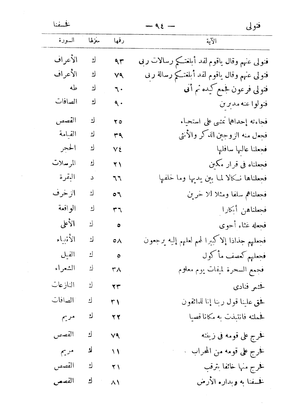 فتولى عنهم وقال يا قوم لقد أبلغتكم رسالات ربي 93 ك الأعراف فتولى عنهم وقال يا قوم لقد أبلغتكم رسالة ربي 79 ك الأعراف فتولى فرعون فجمع كيده ثم أتى 60 ك طه فتولوا عنه مدبرين 90 ك الصافات فجاءته إحداهما تمشي على استحياء 25 ك القصص فجعل منه الزوجين الذكر والأنثى 39 ك القيامة فجعلنا عاليها سافلها 74 ك الحجر