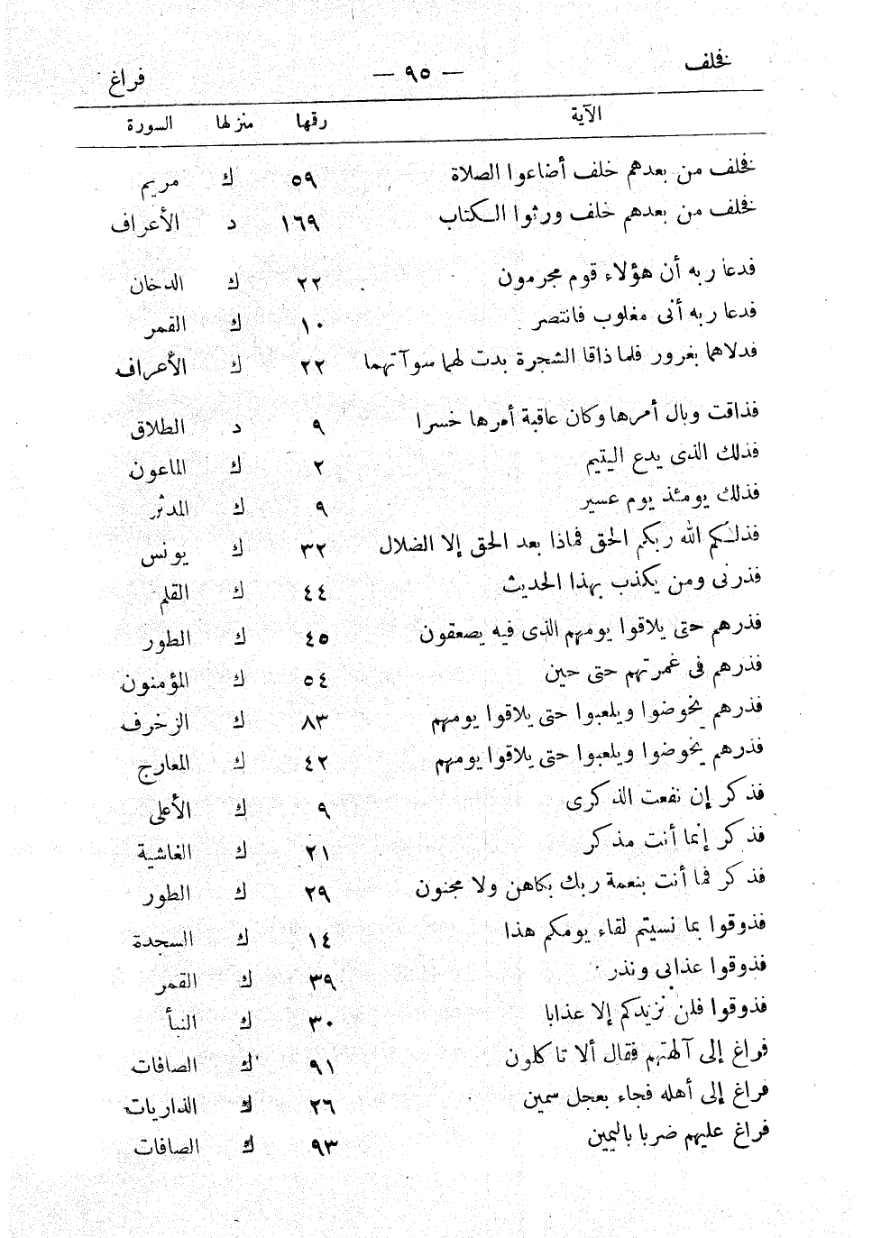 فذلك الذي يدع اليتيم 2 ك الماعون فذلك يومئذ يوم عسير 9 ك المدثر فذلكم الله ربكم الحق فماذا بعد الحق إلا الضلال 32 ك يونس فذرني ومن يكذب بهذا الحديث 44 ك القلم فذرهم حتى يلاقوا يومهم الذي فيه يصعقون 45 ك الطور فذرهم في غمرتهم حتى حين 54 ك المؤمنون فذرهم يخوضوا ويلعبوا حتى يلاقوا يومهم 83 ك الزخرف فذرهم يخوضوا ويلعبوا حتى يلاقوا يومهم 42 ك المعارج فذكر إن نفعت الذكرى 9 ك الأعلى فذكر إنما أنت مذكر 21 ك الغاشية فذكر فما أنت بنعمة ربك بكاهن ولا مجنون 29 ك الطور فذوقوا بما نسيتم لقاء يومكم هذا 14 ك السجدة فذوقوا عذابي ونذر 39 ك القمر فذوقوا فلن نزيدكم إلا عذابا 30 ك النبأ فراغ إلى آلهتهم فقال ألا تأكلون 91 ك الصافات فراغ إلى أهله فجاء بعجل سمين 26 ك الذاريات فراغ عليهم ضربا باليمين 93 ك الصافات