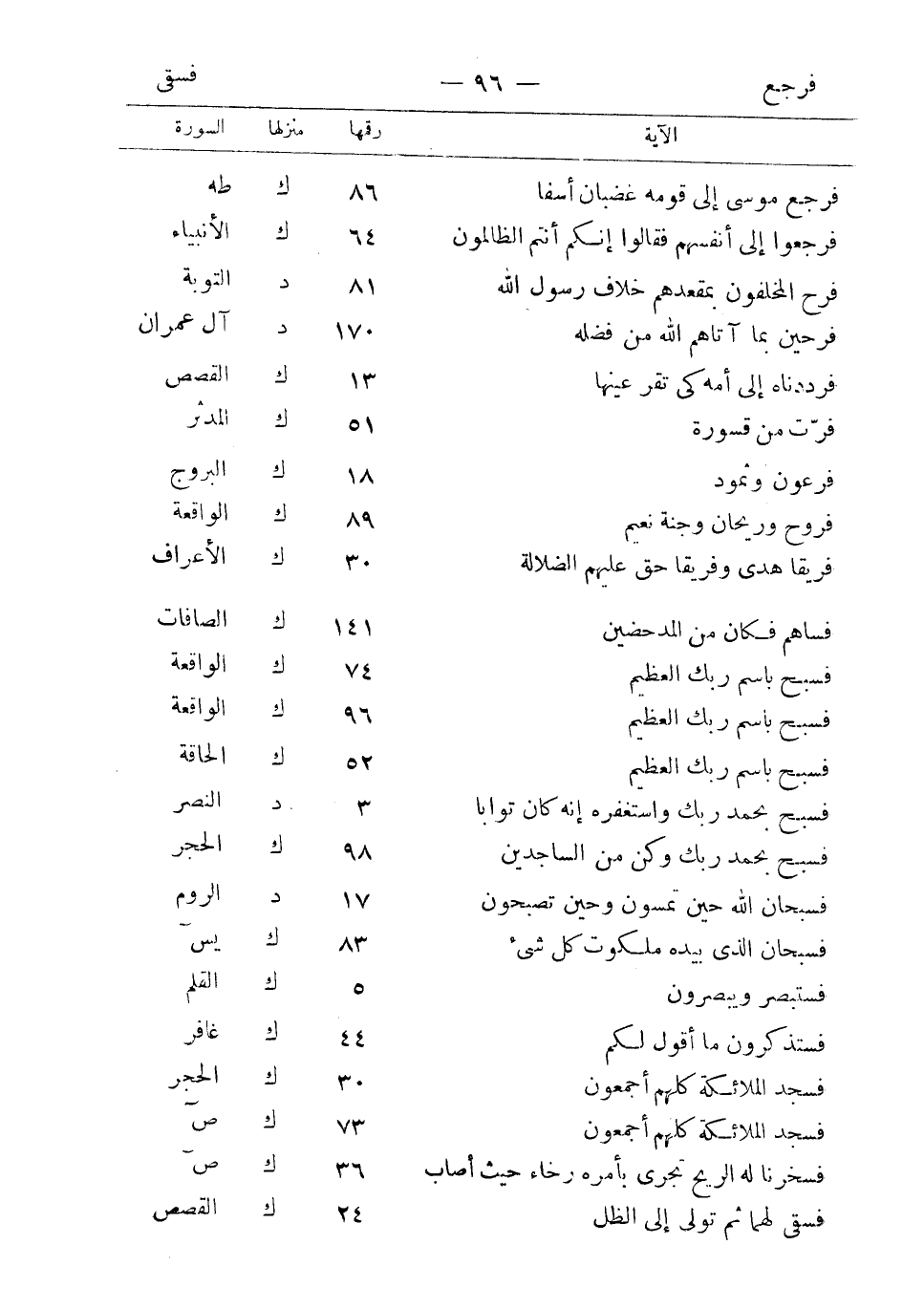 فرددناه إلى أمه كي تقر عينها 13 ك القصص فرت من قسورة 51 ك المدثر فرعون وثمود 18 ك البروج فروح وريحان وجنة نعيم 89 ك الواقعة فريقا هدى وفريقا حق عليهم الضلالة 30 ك الأعراف فساهم فكان من المدحضين 141 ك الصافات فسبح باسم ربك العظيم 74 ك الواقعة فسبح باسم ربك العظيم 96 ك الواقعة فسبح باسم ربك العظيم 52 ك الحاقة فسبح بحمد ربك واستغفره إنه كان توابا 3 د النصر فسبح بحمد ربك وكن من الساجدين 98 ك الحجر فسبحان الله حين تمسون وحين تصبحون 17 د الروم فسبحان الذي بيده ملكوت كل شئ 83 ك يس فستبصر ويبصرون 5 ك القلم فستذكرون ما أقول لكم 44 ك غافر فسجد الملائكة كلهم أجمعون 30 ك الحجر فسجد الملائكة كلهم أجمعون 73 ك ص فسخرنا له الريح تجري بأمره رخاء حيث أصاب 36 ك ص فسقى لهما ثم تولى إلى الظل 24 ك القصص