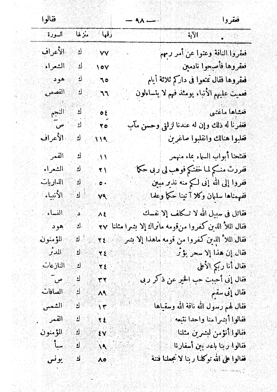 فعقروها فقال تمتعوا في داركم ثلاثة أيام 65 ك هود فعميت عليهم الأنباء يومئذ فهم لا يتساءلون 66 ك القصص فغشاها ما غشى 54 ك النجم فغفرنا له ذلك وإن له عندنا لزلفى وحسن مآب 25 ك ص فغلبوا هنالك وانقلبوا صاغرين 119 ك الأعراف ففتحنا أبواب السماء بماء منهمر 11 ك القمر ففرت منكم لما خفتكم فوهب لي ربي حكما 21 ك الشعراء ففروا إلى الله إني لكم منه نذير مبين 50 ك الذاريات ففهمناها سليمان وكلا آتينا حكما وعلما 79 ك النبياء فقاتل في سبيل الله لا تكلف إلا نفسك 84 د النساء فقال الملأ الذين كفروا من قومه ما نراك إلا بشرا مثلنا 27 ك هود فقال الملأ الذين كفروا من قومه ما هذا إلا بشر 24 ك المؤمنون فقال إن هذا إلا سحر يؤثر 24 ك المدثر فقال أنا ربكم الأعلى 24 ك النازعات فقال إني أحببت حب الخير عن ذكر ربي 32 ك ص فقال إني سقيم 89 ك الصافات فقال لهم رسول الله ناقة الله وسقياها 13 ك الشمس فقالوا أبشرا منا واحد نتبعه 24 ك القمر فقالوا أنؤمن لبشرين مثلنا 47 ك المؤمنون فقالوا ربنا باعد بين أسفارنا 19 ك سبأ فقالوا على الله توكلنا ربنا لا تجعلنا فتنة 85 ك يونس