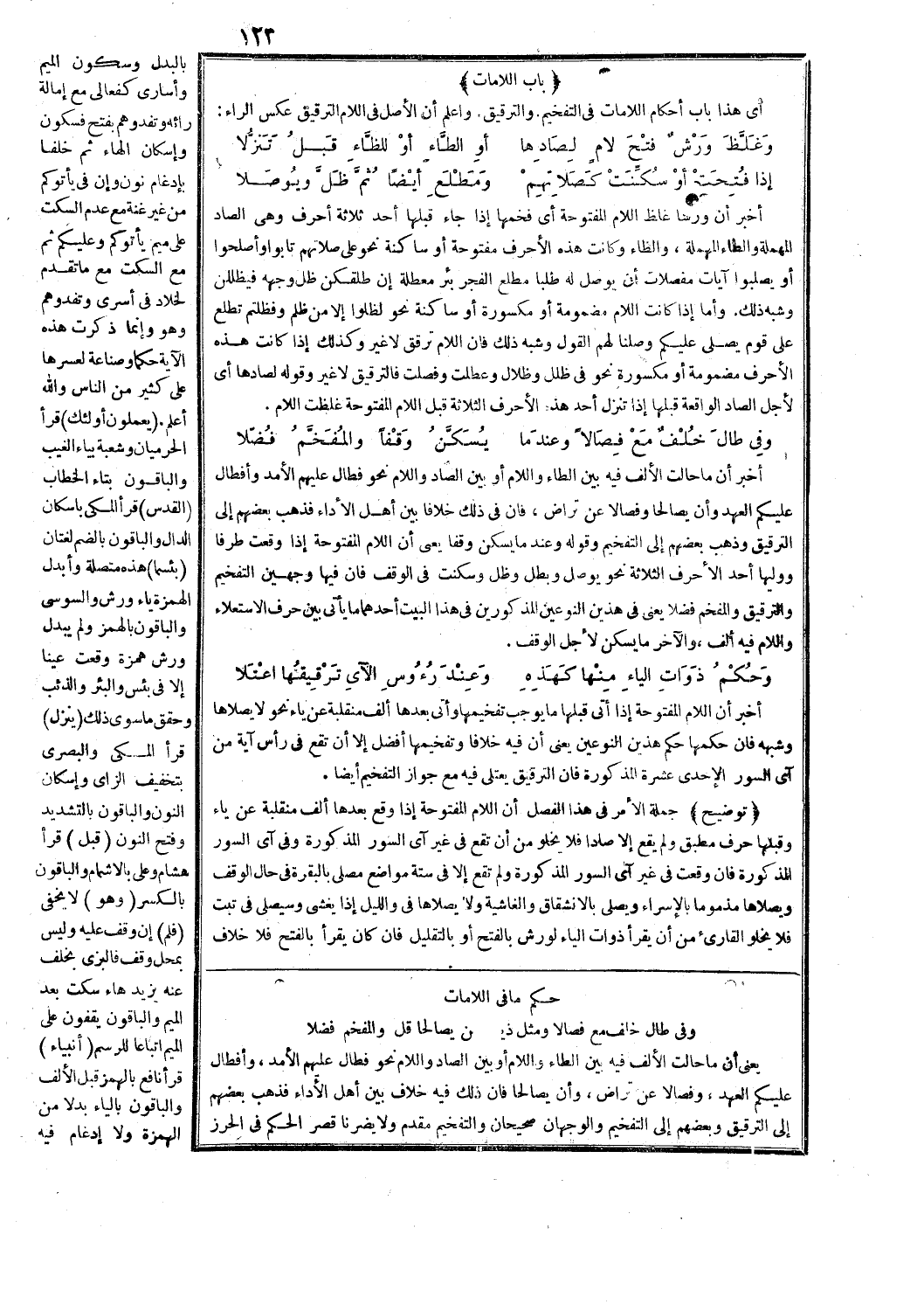 توضيح: جملة الأمر في هذا الفصل أن اللام المفتوحة إذا وقع بعدها ألف منقلبة عن ياء وقبلها حرف مطبق ولم يقع إلا صادا فلا يخلو من أن تقع في غير آي السور المذكورة وفي آي السور المذكورة فإن وقعت في غير آي السور المذكورة ولم تقع إلا في ستة مواضع مصلي بالبقرة في حال الوقف ويصلاها مذموما بالإسراء ويصلي بالانشقاق والغاشية ولا يصلاها في وَاللَّيْلِ إِذا يَغْشى [الليل: 1]، وسيصلي في تبت فلا يخلو القارئ من أن يقرأ ذوات الياء لورش بالفتح أو بالتقليل فإن كان يقرأ بالفتح فلا خلاف