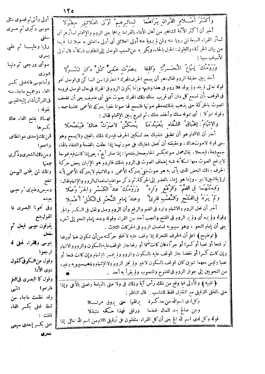 توضيح: اعلم أن الحرف المتحرك إذا وقف عليه لا تخلو حركته من أن تكون ضما أو رفعا أو فتحا أو نصبا أو كسرا أو جرا، فإن كانت ضما أو رفعا جاز الوقف عليه بالسكون والروم والإشمام وإن كانت كسرا أو خفضا جاز الوقف عليه بالسكون والروم ولم يجز الإشمام وإن كانت فتحا أو نصبا وليس معهما تنوين كان الوقف بالسكون لا غير ولم يجز الروم ولا الإشمام وذهب سيبويه وغيره من النحويين إلى جواز الروم في المفتوح والمنصوب ولم يقرأ به أحد.