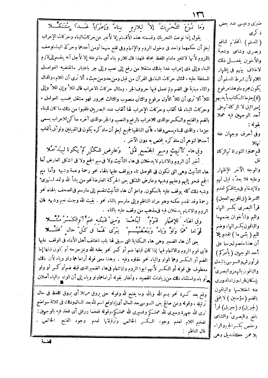 الإعراب ليعلم أن حكمهما واحد في دخول الروم والإشمام وفي المنع منهما أو من أحدهما وحركة البناء توصف باللزوم لأنها لا تتغير ما دام اللفظ بحاله فلهذا قال للازم بناء أي ما نوعته إلا لأجل أنه ينقسم إلى لازم البناء وإلى ذي إعراب غدا بذلك متنقلا من رفع إلى نصب وإلى جر باعتبار ما تقتضيه العوامل المسلطة عليه، فمثال حركات البناء في القرآن من قبل ومن بعد ومن حيث، ألا ترى أن اللام، والدال والثاء مبنية على الضم ولم تعمل فيها حروف الجر، ومثال حركات الإعراب قال الملأ وإن الملأ وإلى الملأ ألا ترى أن الملأ الأول مرفوع والثاني منصوب والثالث مجرور فهو منتقل بحسب العوامل، وحركات البناء لها ألقاب وحركات الإعراب لها ألقاب عند البصريين فلقبوا من ذلك ما كان للبناء بالضم والفتح والكسر، والذي للإعراب بالرفع والنصب والجر، والذي آخره ساكن للإعراب يسمى جزما، والذي للبناء يسمى وقفا، فأتى الناظم بالجميع ليعلم أن ما ذكره يكون في القبيلين ولو أتى بألقاب أحدهما لتوهم أن ما ذكره يختص به دون الآخر.