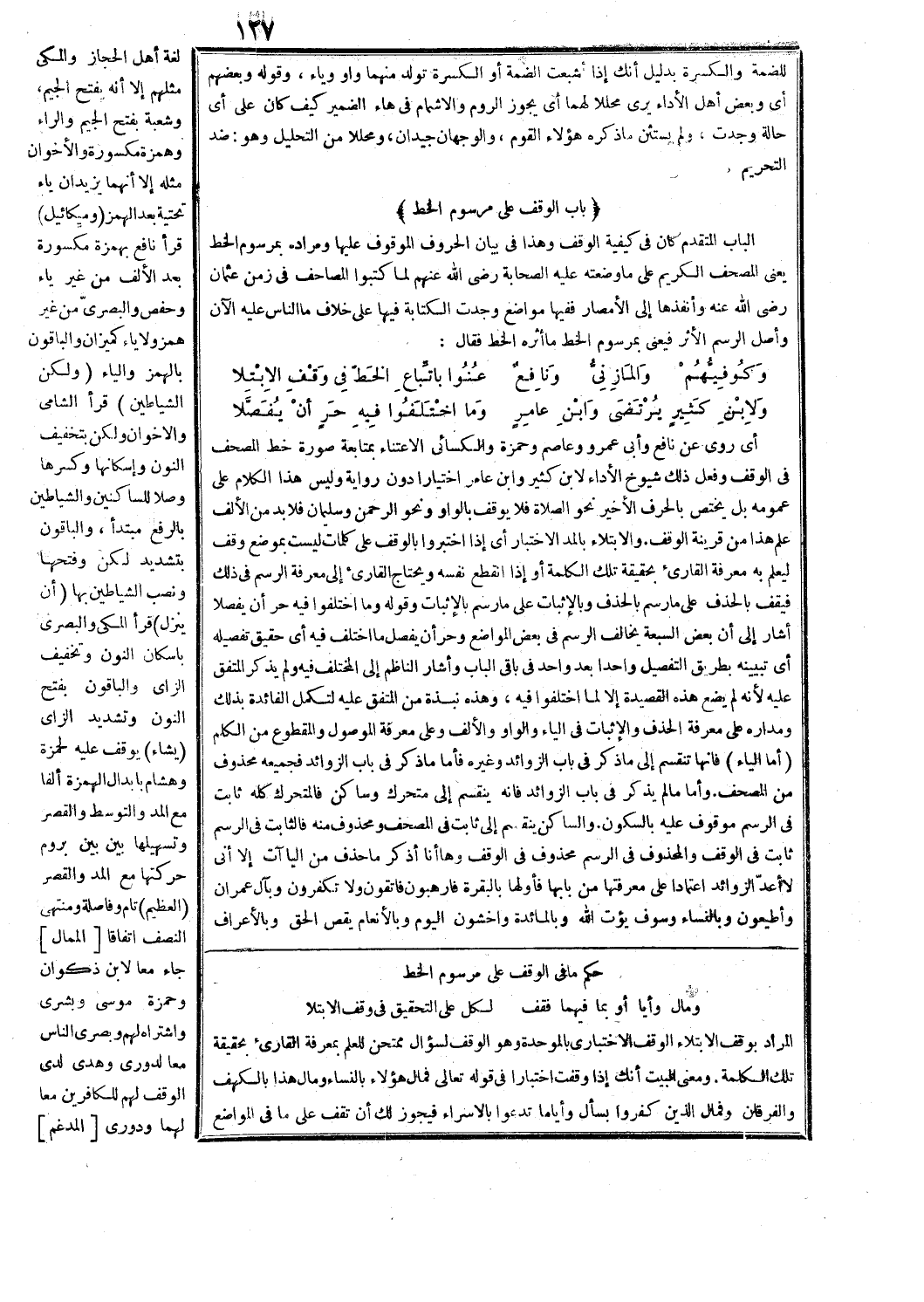 أي روي عن نافع وأبي عمرو وعاصم وحمزة والكسائي الاعتناء بمتابعة صورة خط المصحف في الوقف وفعل ذلك شيوخ الأداء لابن كثير وابن عامر اختيارا دون رواية وليس هذا الكلام على عمومه بل يختص بالحرف الأخير نحو الصلاة فلا يوقف بالواو ونحو الرحمن وسليمان فلا بد من الألف علم هذا من قرينة الوقف. والابتلاء بالمد الاختبار أي إذا اختبروا بالوقف على كلمات ليست بموضع وقف ليعلم به معرفة القارئ بحقيقة تلك الكلمة أو إذا انقطع نفسه ويحتاج القارئ إلى معرفة الرسم في ذلك فيقف بالحذف على ما رسم بالحذف وبالإثبات على ما رسم بالإثبات، وقوله: وما اختلفوا فيه حر أن يفصلا أشار إلى أن بعض السبعة يخالف الرسم في بعض المواضع وحر أن يفصل ما اختلف فيه أي حقيق تفصيله أي تبيينه بطريق التفصيل واحدا بعد واحد في باقي الباب وأشار الناظم إلى المختلف فيه ولم يذكر المتفق عليه لأنه لم يضع هذه القصيدة إلا لما اختلفوا فيه، وهذه نبذة من المتفق عليه لتكمل الفائدة بذلك ومداره على معرفة الحذف والإثبات في الياء والواو والألف وعلى معرفة الموصول والمقطوع من الكلم (أما الياء) فإنها تنقسم إلى ما ذكر في باب الزوائد وغيره فأما ما ذكر في باب الزوائد فجميعه محذوف من المصحف. وأما ما لم يذكر