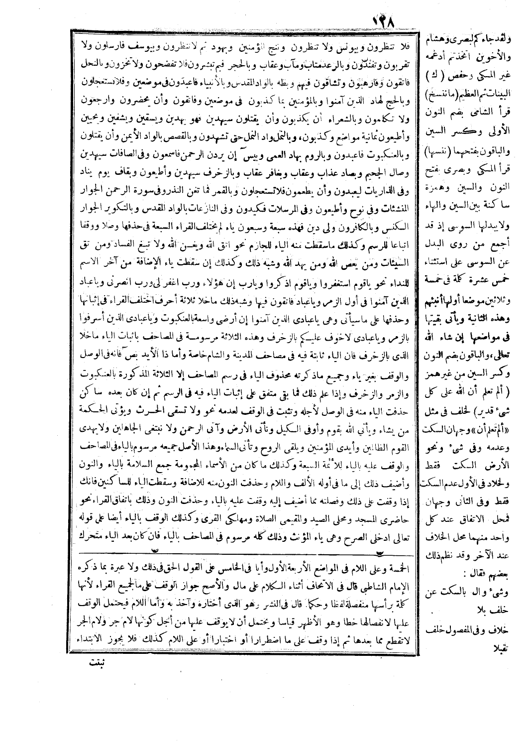 30] ويا عِبادِ الَّذِينَ آمَنُوا [الزمر: 10] ويا عِبادِ فَاتَّقُونِ [الزمر: 16]، فيها وشبه ذلك ما خلا ثلاثة أحرف اختلف القراء في إثباتها وحذفها على ما سيأتي وهي: يا عِبادِيَ الَّذِينَ آمَنُوا إِنَّ أَرْضِي واسِعَةٌ [العنكبوت: 56] ويا عِبادِيَ الَّذِينَ أَسْرَفُوا [الزمر: 53] ويا عِبادِ لا خَوْفٌ عَلَيْكُمُ [الزخرف: 68]، وهذه الثلاثة مرسومة في المصاحف بإثبات الياء ما خلا الذي بالزخرف فإن الياء ثابتة فيه في مصاحف المدينة والشام خاصة، وأما ذَا الْأَيْدِ [ص: 17]، فإنه في الوصل والوقف بغير ياء وجميع ما ذكرته محذوف الياء في رسم المصاحف إلا الثلاثة المذكورة بالعنكبوت والزمر والزخرف وإذا علم ذلك فما بقي متفق على إثبات الياء فيه في الرسم ثم إن كان بعده ساكن حذفت الياء منه في الوصل لأجله وتثبت في الوقف لعدمه نحو وَلا تَسْقِي الْحَرْثَ [البقرة: 71] ويُؤْتِي الْحِكْمَةَ مَنْ يَشاءُ [البقرة: 269] ويَأْتِي اللَّهُ بِقَوْمٍ [المائدة: 54] وأُوفِي الْكَيْلَ [يوسف:
