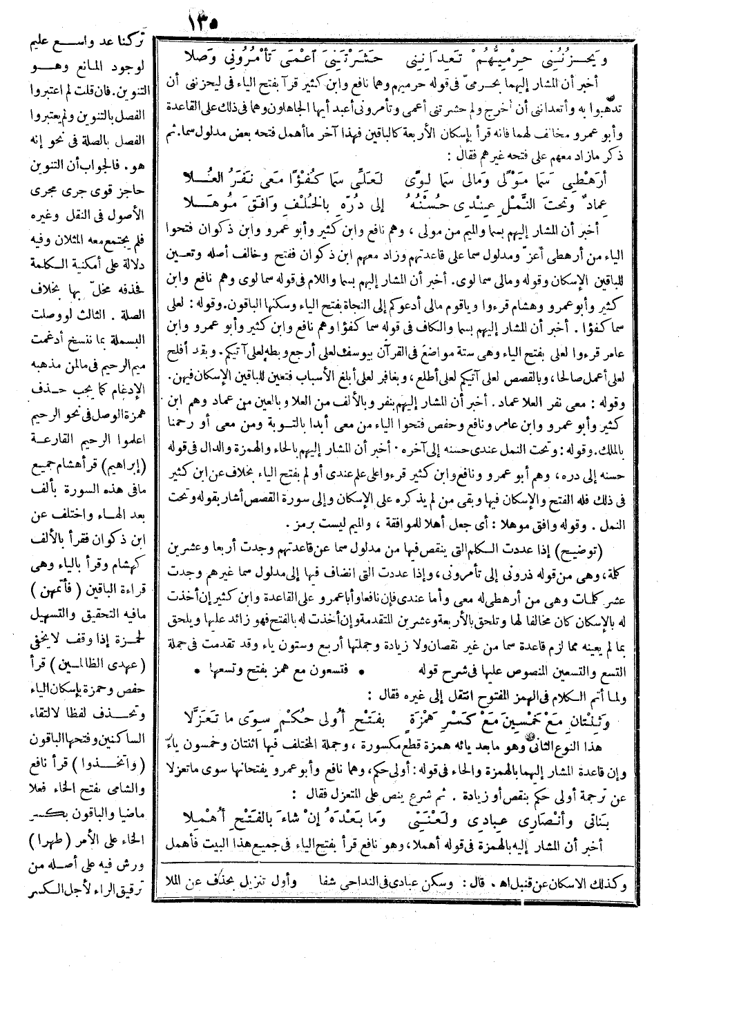 أخبر أن المشار إليهما بحرمي في قوله: حرميهم وهما نافع وابن كثير قرآ بفتح الياء في لَيَحْزُنُنِي أَنْ تَذْهَبُوا بِهِ [يوسف: 13] وأَ تَعِدانِنِي أَنْ أُخْرَجَ [الأحقاف: 17] ولِمَ حَشَرْتَنِي أَعْمى [طه: 125] وتَأْمُرُونِّي أَعْبُدُ أَيُّهَا الْجاهِلُونَ [الزمر: 64] وهما في ذلك على القاعدة وأبو عمرو مخالف لهما فإنه قرأ بإسكان الأربعة كالباقين فهذا آخر ما أهمل فتحه بعض مدلول سما. ثم ذكر ما زاد معهم على فتحه غيرهم فقال: