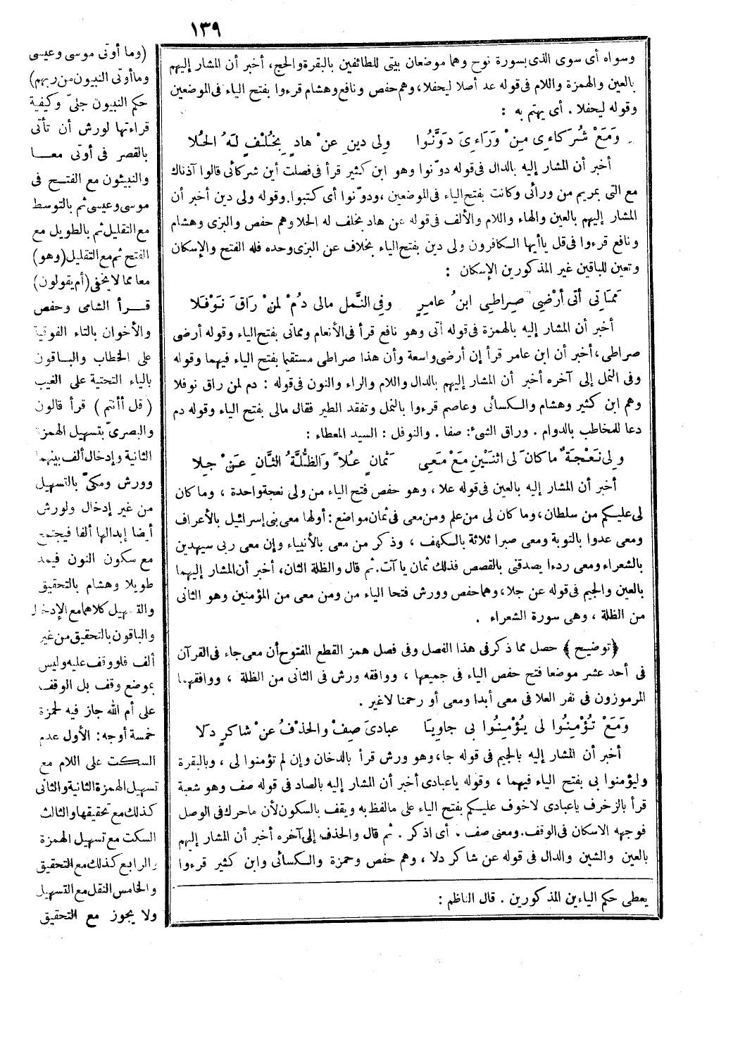 أخبر أن المشار إليه بالهمزة في قوله أتى وهو نافع قرأ في الأنعام ومماتي بفتح الياء وقوله: أرضي صراطي، أخبر أن ابن عامر قرأ إن أرضي واسعة وأن هذا صراطا مستقيما بفتح الياء فيهما وقوله: وفي النمل إلى آخره أخبر أن المشار إليهم بالدال واللام والراء والنون في قوله: دم لمن راق نوفلا وهم ابن كثير وهشام والكسائي وعاصم قرءوا بالنمل وتفقد الطير فقال ما لي بفتح الياء وقوله دم دعا للمخاطب بالدوام. وراق الشيء: صفا.