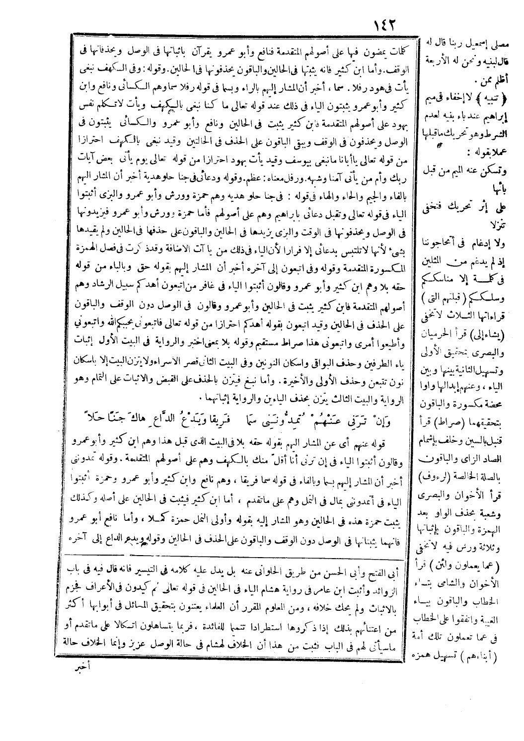 كثير يثبت في الحالين ونافع وأبو عمرو والكسائي يثبتون في الوصل ويحذفون في الوقف ويبقى الباقون على الحذف في الحالتين وقيد نَبْغِي بالكهف احترازا من قوله تعالى يا أَبانا ما نَبْغِي [يوسف: 65] بيوسف وقيد (يأت بهود) احترازا من قوله تعالى: يَوْمَ يَأْتِي بَعْضُ آياتِ رَبِّكَ [الأنعام: 158]، وأم من يأتي آمنا وشبهه. ورفل معناه: عظم. وقوله ودعائي في جنا حلو هدية أخبر أن المشار إليهم بالفاء والجيم والحاء والهاء في قوله: في جنا حلو هديه وهم حمزة وورش وأبو عمرو والبزي أثبتوا الياء في قوله تعالى و (تقبل دعائي) [إبراهيم: 40]، وهم على أصولهم فأما حمزة وورش وأبو عمرو فيزيدونها في الوصل ويحذفونها في الوقت والبزي يزيدها في الحالين والباقون على حذفها في الحالين ولم يقيدها بشيء لأنها لا تلتبس بدعائي إلا فرارا لأن الياء في ذلك من ياءات الإضافة وقد ذكرت في فصل الهمزة المكسورة المتقدمة وقوله وفي اتبعون إلى آخره أخبر أن المشار إليهم بقوله حق وبالباء من قوله حقه بلا وهم ابن كثير وأبو عمرو وقالون أثبتوا الياء في غافر (من اتبعون أهدكم سبيل الرشاد) [غافر: 38]، وهم أصولهم المتقدمة فابن كثير يثبت في الحالين وأبو عمرو وقالون في الوصل دون الوقف والباقون على الحذف في الحالين وقيد اتبعون بقوله أهدكم احترازا من قوله تعالى فَاتَّبِعُونِي يُحْبِبْكُمُ اللَّهُ [آل عمران: 31]، فَاتَّبِعُونِي وَأَطِيعُوا أَمْرِي [طه: 90]، و (اتبعوني هذا صراط مستقيم) [الزخرف: 61]، وقوله بلا بمعنى اختبر والرواية في البيت الأول إثبات ياء الطرفين وحذف البواقي وإسكان النونين وفي البيت الثاني قصر الإسراء ولا يتزن البيت إلا بإسكان نون تتبعن وحذف الأولى والأخيرة. وأما نبغ فيتزن بالحذف على القبض والإثبات على التمام وهو الرواية والبيت الثالث يتزن بحذف الياءين والرواية إثباتهما.