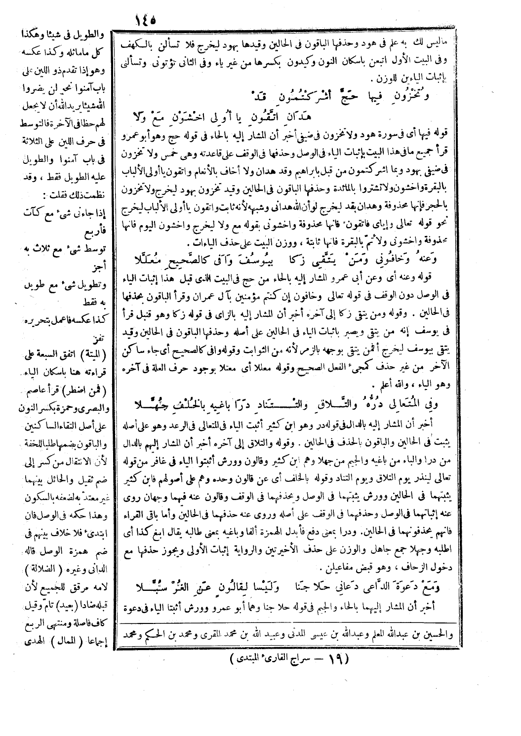 أُولِي الْأَلْبابِ البقرة، وَاخْشَوْنِ وَلا تَشْتَرُوا [المائدة: 44]، وحذفها الباقون في الحالين وقيد تخزون، ليخرج وَلا تُخْزُونِ بالحجر فإنها محذوفة وهدان بقد ليخرج لو أن الله هداني وشبهه لأنه ثابت واتقون يا أولي الألباب ليخرج نحو قوله تعالى وَإِيَّايَ فَاتَّقُونِ فإنها محذوفة وَاخْشَوْنِي بقوله مع ولا ليخرج واخشون اليوم فإنها محذوفة واخشوني ولأتمّ بالبقرة فإنها ثابتة، ووزن البيت على حذف الياءات.