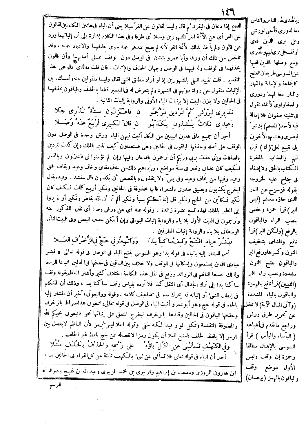 يصح عندهم عنه سوى حذفهما والاعتماد عليه، وقد تلخص من ذلك أن ورشا وأبا عمرو يثبتان في الوصل دون الوقف على أصليهما وأن قالون يحذفهما في الوقف وله فيهما في الوصل وجهان الحذف والإثبات. فإن قلت ما الذي دل على هذا التقدير. قلت تقييد النفي بالمشهورين إذ لو أراد مطلق النفي لقال وليسا منقولين عنه وأمسك، بل الإثبات منقول عن رواة دونهم في الشهرة ولم يتعرض له في التيسير قطعا بالحذف والباقون بحذفهما في الحالين ولا يتزن البيت إلا بإثبات الياء الأولى والرواية إثبات الثانية.