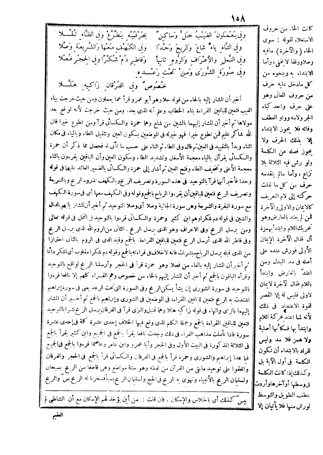 احترازا من الذي قبله (يرسل الرياح مبشرات) [الأعراف: 57]، فإنه لا خلاف في قراءته بالجمع وقوله دم شكرا مقلوب أي اشكر دائما ثم أخبر أن المشار إليه بالفاء من فصلا وهو حمزة قرأ في الحجر (وأرسلنا الريح) [الحجر: 22]، لواقح بالتوحيد وقرأه الباقون بالجمع ثم أخبر أن المشار إليهم بالخاء من خصوص وهم القراء كلهم إلا نافعا قرءوا بالتوحيد في سورة الشورى إِنْ يَشَأْ يُسْكِنِ الرِّيحَ [فاطر: 9]، وفي السورة التي تحت الرعد يعني في سورة إبراهيم اشْتَدَّتْ بِهِ الرِّيحُ [الروم: 46]، فتعين للباقين القراءة في الموضعين في الشورى وإبراهيم بالجمع ثم أخبر أن المشار إليهما بالزاي والهاء في قوله زاكيه هللا وهما قنبل والبزي قرآ في الفرقان يرسل الريح نشرا بالتوحيد فتعين للباقين القراءة بالجمع وجملة الكلم الذي وقع فيها الخلاف إحدى عشرة كلمة في إحدى عشرة سورة فإذا تأملت مذاهب القراء في ذلك وجدت نافعا يقرأ بالجمع في الجميع وابن كثير يقرأ بالجمع في الثلاثة المذكورة في البيت الأول وفي الحجر وأبا عمرو وابن عامر وعاصما قرءوا بالجمع في الجميع فيما عدا إبراهيم والشورى وحمزة قرأ بالجمع في الفرقان والكسائي قرأ بالجمع في الحجر والفرقان واتفقوا على توحيد ما بقي من القرآن من لفظه وهو ستة مواضع وهي قاصِفاً مِنَ الرِّيحِ [الإسراء: 69]، بسبحان وَلِسُلَيْمانَ الرِّيحَ [الروم: 51]، بالأنبياء أَوْ تَهْوِي بِهِ الرِّيحُ [الحج: 31]، وَلِسُلَيْمانَ الرِّيحَ [سبأ: 12]، فَسَخَّرْنا لَهُ الرِّيحَ [ص: 36]، (والريح