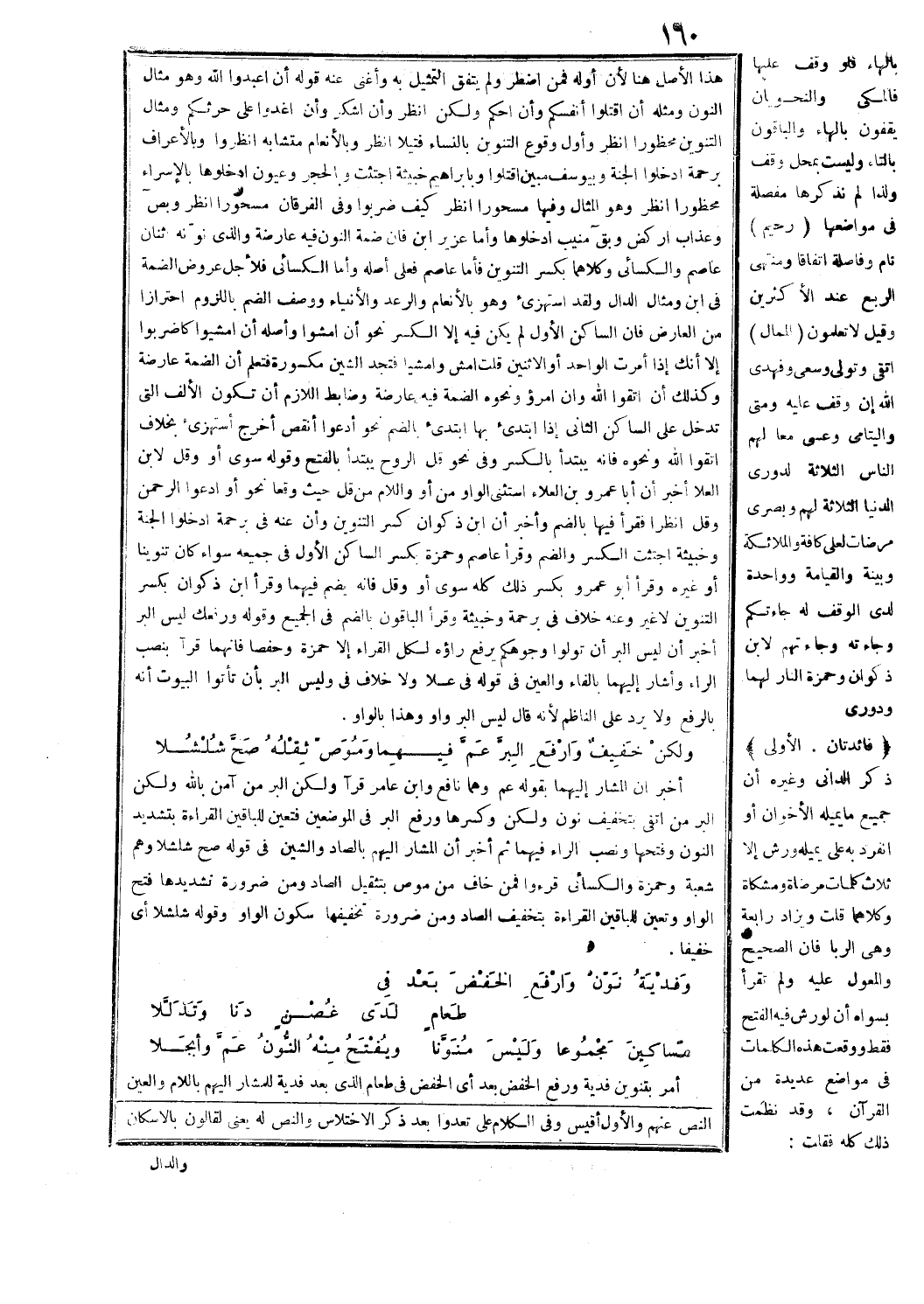 42]، وبالأعراف بِرَحْمَةٍ ادْخُلُوا الْجَنَّةَ، وبيوسف مُبِينٍ اقْتُلُوا وبإبراهيم خَبِيثَةٍ اجْتُثَّتْ وبالحجر وَعُيُونٍ ادْخُلُوها بالإسراء محظورا انظر وهو المثال وفيها مَسْحُوراً انْظُرْ كَيْفَ ضَرَبُوا [الفرقان: 9]، وفي الفرقان مَسْحُوراً [الفرقان: 8]، انْظُرْ وبص وعَذابٌ [ص: 26]، ارْكُضْ [الأنعام: 11]، وبق مُنِيبٍ [ق: 8]، ادْخُلُوها [ق: 34]، وأما عزير ابن فإن ضمة النون فيه عارضة والذي نوّنه اثنان عاصم والكسائي