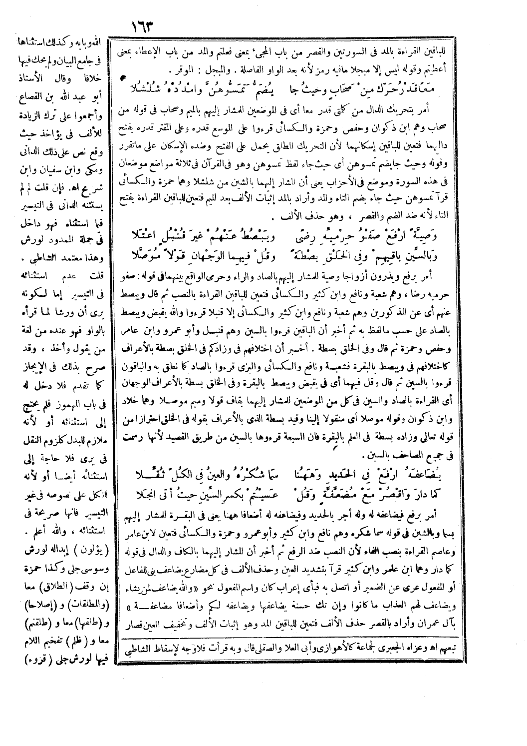 أمر برفع فيضاعفه له وله أجر بالحديد وفيضاعفه له أضعافا هاهنا يعني في البقرة للمشار إليهم بسما وبالشين في قوله سما شكره وهم نافع وابن كثير وأبو عمرو وحمزة والكسائي فتعين لابن عامر وعاصم القراءة بنصب الفاء لأن النصب ضد الرفع ثم أخبر أن المشار إليهما بالكاف والدال في قوله كما دار وهما ابن عامر وابن كثير قرآ بتشديد العين وحذف الألف في كل مضارع يضاعف بني للفاعل أو المفعول عرى عن الضمير أو اتصل به فبأي إعراب كان واسم المفعول نحو وَاللَّهُ يُضاعِفُ لِمَنْ يَشاءُ [البقرة: 261]، ويُضاعَفُ لَهُمُ الْعَذابُ ما كانُوا [هود: 20]، وَإِنْ تَكُ حَسَنَةً يُضاعِفْها [النساء: