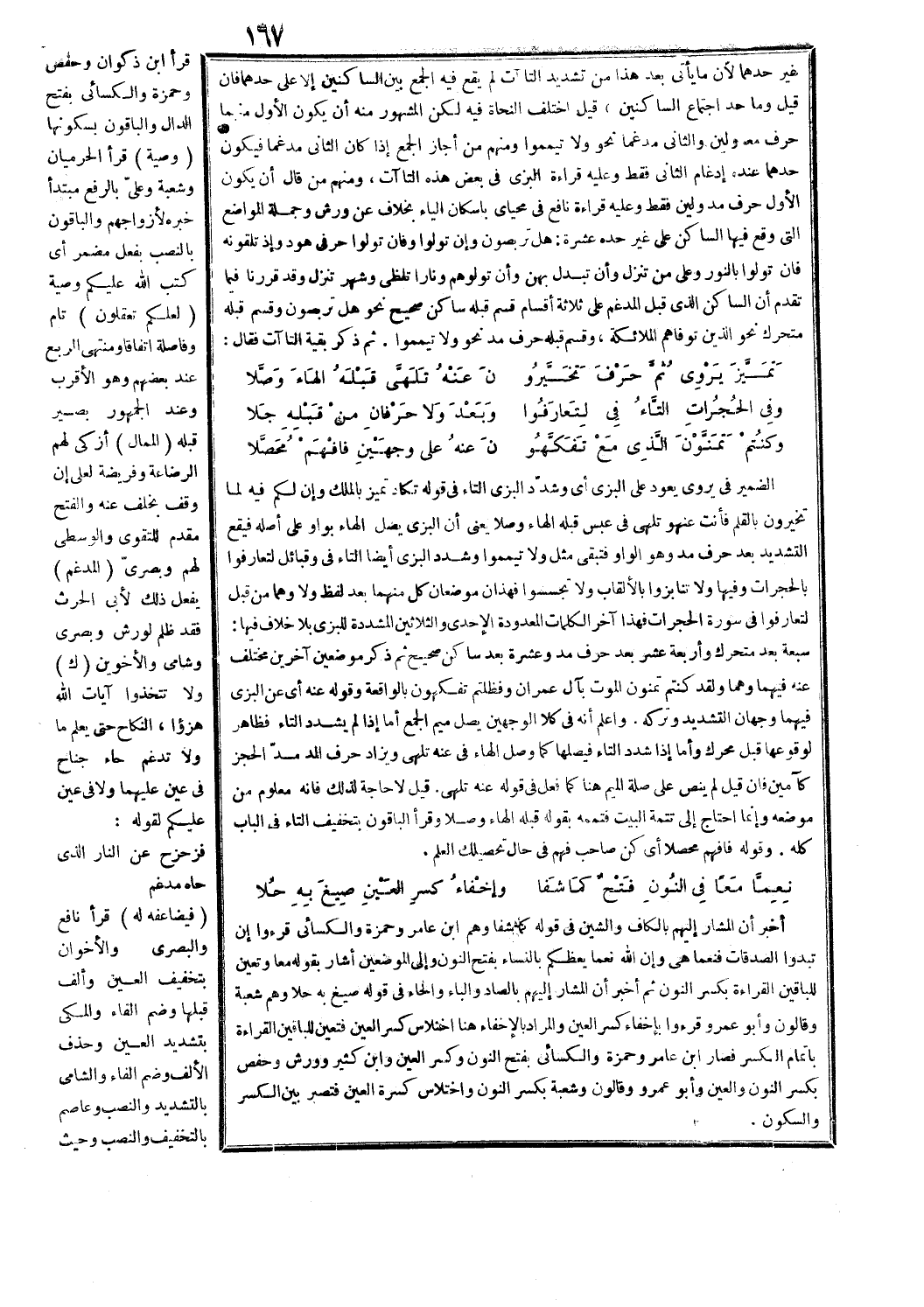 أخبر أن المشار إليهم بالكاف والشين في قوله كما شفا وهم ابن عامر وحمزة والكسائي قرءوا إِنْ تُبْدُوا الصَّدَقاتِ فَنِعِمَّا هِيَ وإِنَّ اللَّهَ نِعِمَّا يَعِظُكُمْ [النساء: 58]، بفتح النون وإلى الموضعين أشار بقوله معا وتعين للباقين القراءة بكسر النون ثم أخبر أن المشار إليهم بالصاد والباء والحاء في قوله صيغ به حلا وهم شعبة وقالون وأبو عمرو قرءوا بإخفاء كسر العين والمراد بالإخفاء هنا اختلاس كسر العين فتعين للباقين القراءة بإتمام الكسر فصار ابن عامر وحمزة والكسائي بفتح النون وكسر العين وابن كثير وورش وحفص بكسر النون والعين وأبو عمرو وقالون وشعبة بكسر النون واختلاس كسرة العين فتصير بين الكسر والسكون.