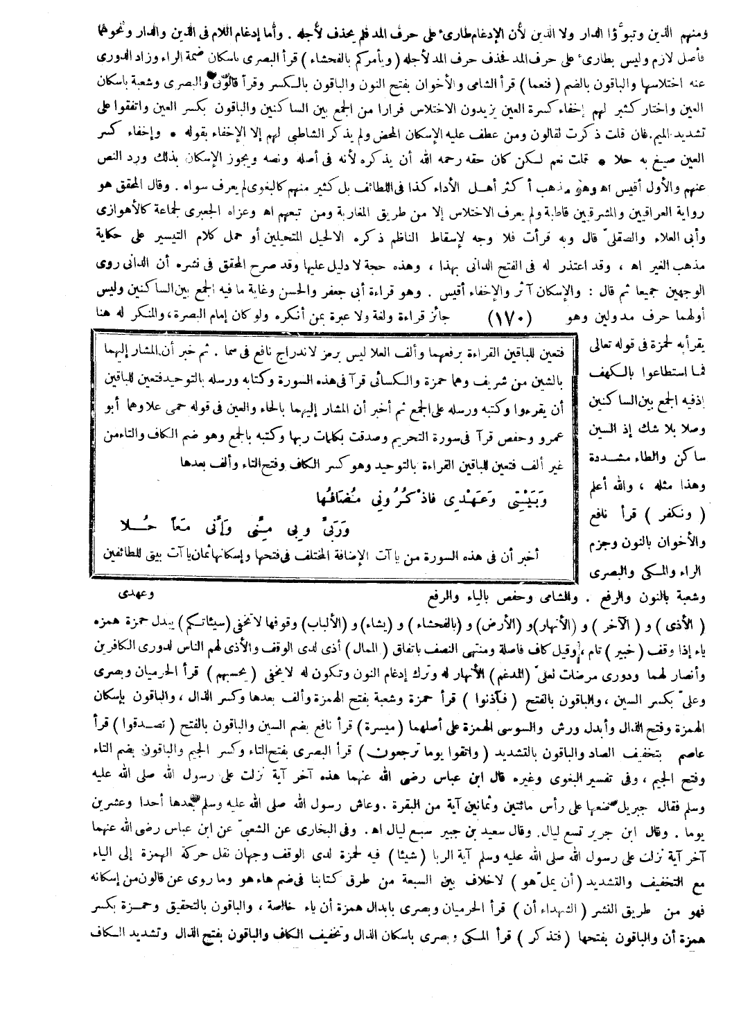 فتعين للباقين القراءة برفعهما وألف العلا ليس برمز لاندراج نافع في سما. ثم خبر أن المشار إليهما بالشين من شريف وهما حمزة والكسائي قرآ في هذه السورة وكتابه ورسله بالتوحيد فتعين للباقين أن يقرءوا وكتبه ورسله على الجمع ثم أخبر أن المشار إليهما بالحاء والعين في قوله حمى علا وهما أبو عمرو وحفص قرآ في سورة التحريم وَصَدَّقَتْ بِكَلِماتِ رَبِّها [التحريم: 12]، وكتبه بالجمع وهو ضم الكاف والتاء من غير ألف فتعين للباقين القراءة بالتوحيد وهو كسر الكاف وفتح التاء وألف بعدها.