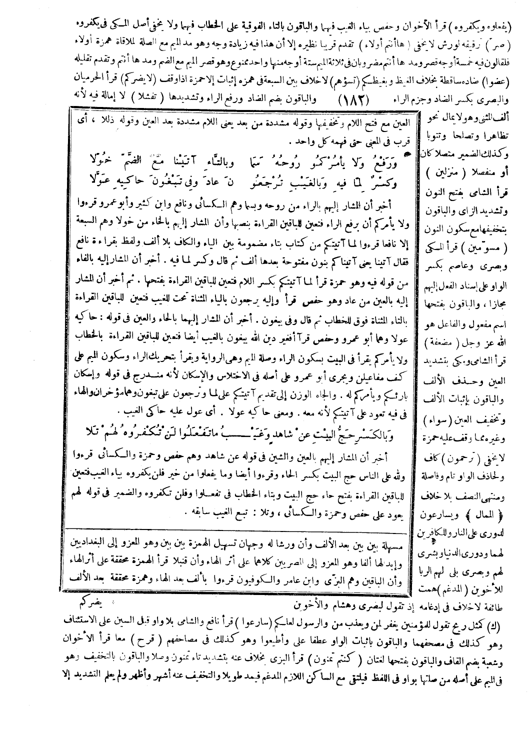 أخبر أن المشار إليهم بالراء من روحه وبسما وهم الكسائي ونافع وابن كثير وأبو عمرو قرءوا ولا يأمركم أن برفع الراء فتعين للباقين القراءة بنصبها وأن المشار إليهم بالخاء من خولا وهم السبعة إلا نافعا قرءوا لما آتيتكم من كتاب بتاء مضمومة بين الياء والكاف بلا ألف ولفظ بقراءة نافع فقال آتينا يعني آتيناكم بنون مفتوحة بعدها ألف ثم قال وكسر لما فيه. أخبر أن المشار إليه بالفاء من قوله فيه وهو حمزة قرأ لما آتيتكم بكسر اللام فتعين للباقين القراءة بفتحها. ثم أخبر أن المشار إليه بالعين من عاد وهو حفص قرأ وإليه يرجعون بالياء المثناة تحت للغيب فتعين للباقين القراءة بالتاء المثناة فوق للخطاب ثم قال وفي يبغون. أخبر أن المشار إليهما بالحاء والعين في قوله: حاكيه عولا وهما أبو عمرو وحفص قرآ (أفغير دين الله يبغون بالغيب) [آل عمران: 83]، أيضا فتعين للباقين القراءة بالخطاب ولا يأمركم يقرأ في البيت بسكون الراء وصلة الميم وهي الرواية ويقرأ بتحريك الراء وسكون الميم على كف مفاعيلن ويجري أبو عمرو على أصله في الاختلاس والإسكان لأنه مندرج في قوله وإسكان بارئكم ويأمركم له. والجاه الوزن إلى تقديم آتيتكم على لما وترجعون على تبغون وهما مؤخران والهاء في فيه تعود على آتيتكم لأنه معه. ومعنى حاكيه عولا. أي عول عليه حاكي الغيب.