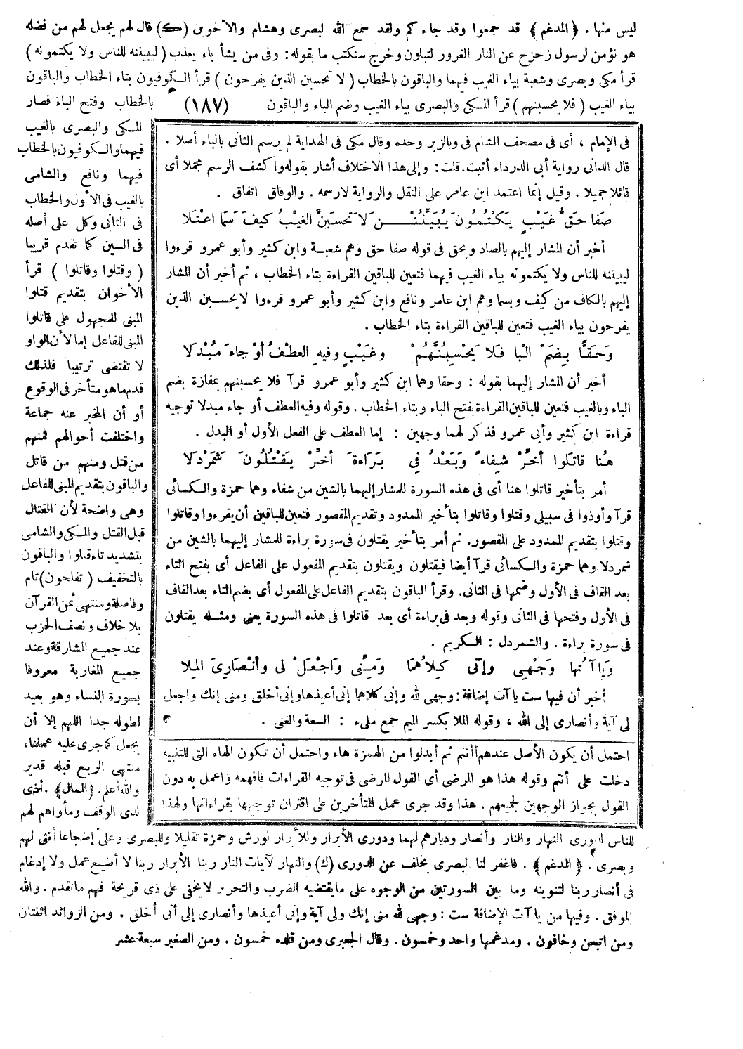 أخبر أن المشار إليهم بالصاد وبحق في قوله صفا حق وهم شعبة وابن كثير وأبو عمرو قرءوا ليبيننه للناس ولا يكتمونه بياء الغيب فيهما فتعين للباقين القراءة بتاء الخطاب، ثم أخبر أن المشار إليهم بالكاف من كيف وبسما وهم ابن عامر ونافع وابن كثير وأبو عمرو قرءوا لا يحسبن الذين يفرحون بياء الغيب فتعين للباقين القراءة