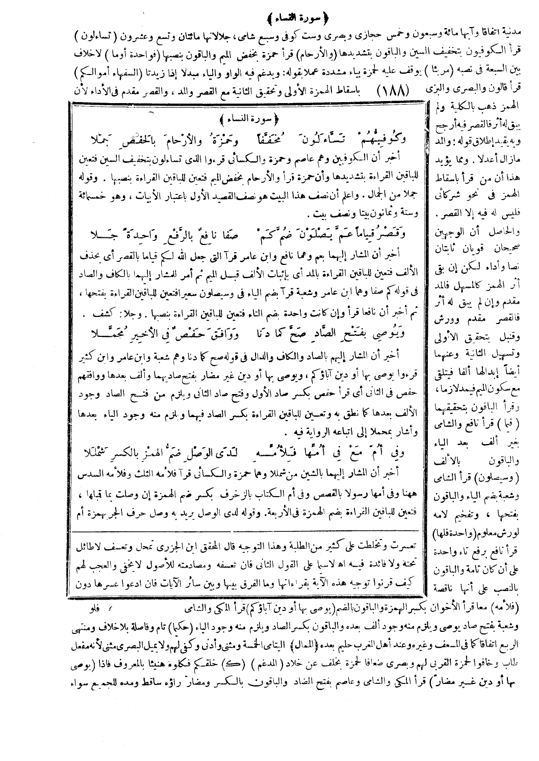 أخبر أن الكوفيين وهم عاصم وحمزة والكسائي قرءوا الذي تساءلون بتخفيف السين فتعين للباقين القراءة بتشديدها وأن حمزة قرأ والأرحام بخفض الميم فتعين للباقين القراءة بنصبها. وقوله جملا من الجمال. واعلم أن نصف هذا البيت هو نصف القصيد الأول باعتبار الأبيات، وهو خمسمائة وستة وثمانون بيتا ونصف بيت.