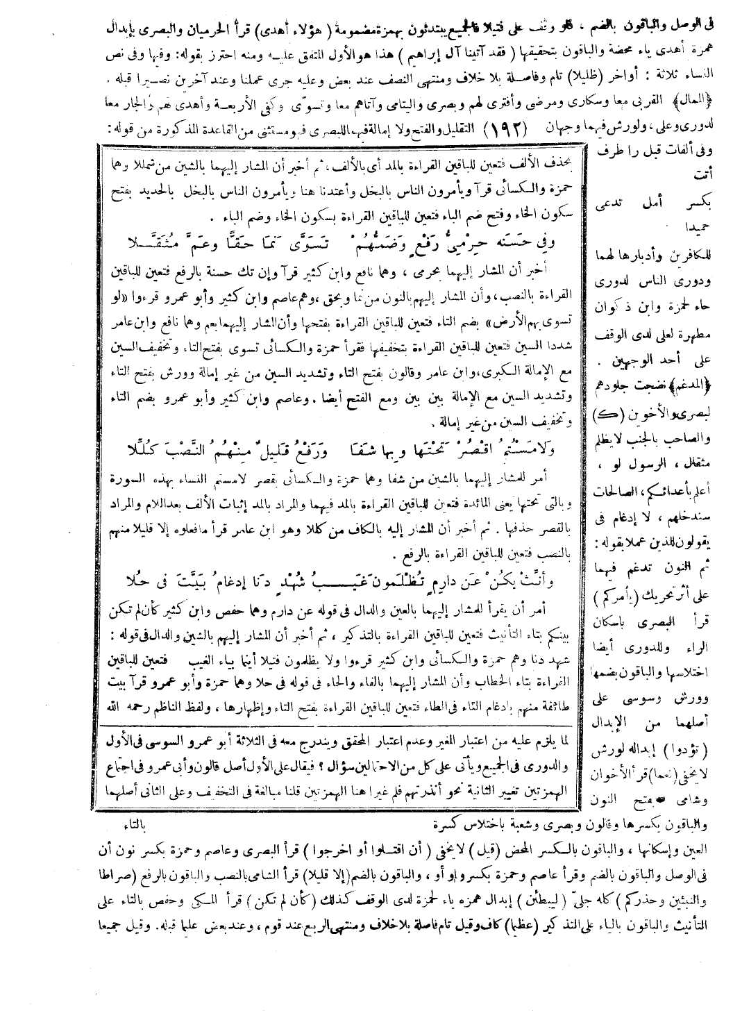 40] بالرفع فتعين للباقين القراءة بالنصب، وأن المشار إليهم بالنون من نما وبحق، وهم عاصم وابن كثير وأبو عمرو قرءوا لَوْ تُسَوَّى بِهِمُ الْأَرْضُ [النساء: 42] بضم التاء فتعين للباقين القراءة بفتحها وأن المشار إليهما بعم وهما نافع وابن عامر شددا السين فتعين للباقين