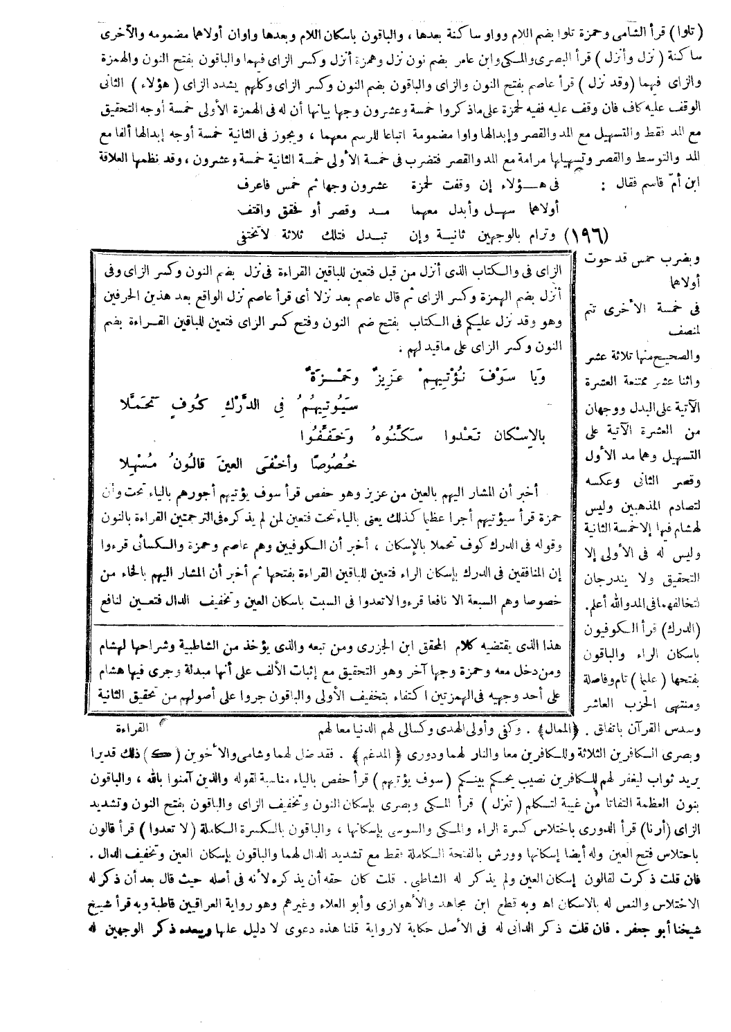 الزاي في والكتاب الذي أنزل من قبل فتعين للباقين القراءة في نزل بضم النون وكسر الزاي وفي أنزل بضم الهمزة وكسر الزاي ثم قال عاصم بعد نزلا أي قرأ عاصم نزل الواقع بعد هذين الحرفين وهو وقد نزل عليكم في الكتاب بفتح ضم النون وفتح كسر الزاي فتعين للباقين القراءة بضم النون وكسر الزاي على ما قيد لهم.