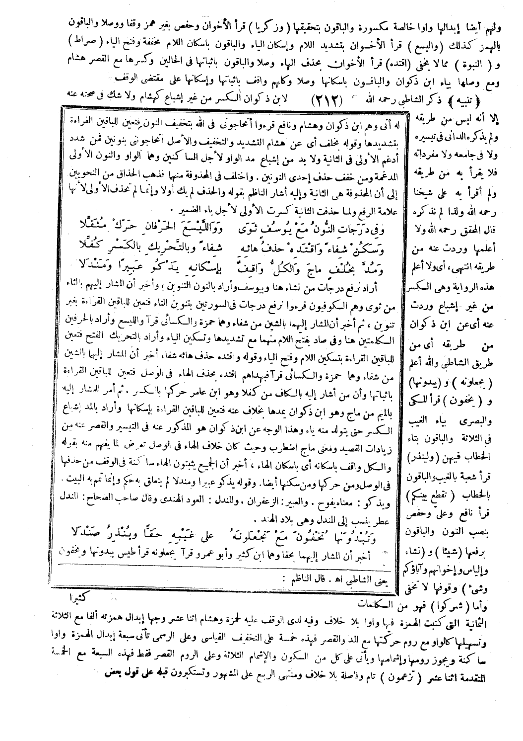 أراد نرفع درجات من نشاء هنا وبيوسف وأراد بالنون التنوين، وأخبر أن المشار إليهم بالثاء من ثوى وهم الكوفيون قرءوا نرفع درجات في السورتين بتنوين التاء فتعين للباقين القراءة بغير تنوين، ثم أخبر أن المشار إليهما بالشين من شفاء وهما حمزة والكسائي قرآ والليسع وأراد بالحرفين الكلمتين هنا وفي صاد بفتح اللام منهما مع تشديدها وتسكين الياء وأراد بالتحريك الفتح فتعين للباقين القراءة بتسكين اللام وفتح الياء وقوله واقتده حذف هائه شفاء أخبر أن المشار إليهما بالشين من شفاء وهما حمزة والكسائي قرآ فبهداهم اقتده بحذف الهاء في الوصل فتعين للباقين القراءة بإثباتها وأن من أشار إليه بالكاف من كفلا وهو ابن عامر حركها بالكسر. ثم أمر للمشار إليه بالميم من ماج وهو ابن ذكوان يمدها بخلاف عنه فتعين للباقين القراءة بإسكانها وأراد بالمد إشباع الكسر حتى يتولد منه ياء وهذا الوجه عن ابن ذكوان هو المذكور عنه في التيسير والقصر عنه من زيادات القصيد ومعنى ماج اضطرب وحيث كان خلاف الهاء في الوصل تعرض لما يفهم منه بقوله والكل واقف