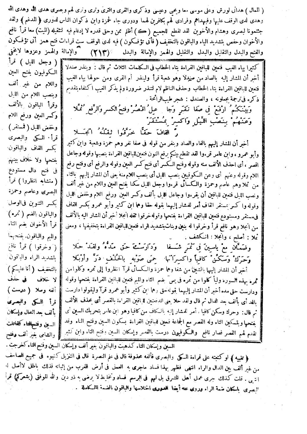 أخبر أن المشار إليهما بالشين من شفا وهما حمزة والكسائي قرآ انظروا إلى ثمره وكلوا من ثمره بهذه السورة ولِيَأْكُلُوا مِنْ ثَمَرِهِ [يس: 35] بضم الثاء والميم فتعين للباقين القراءة بفتحها وقوله ودارست حق مده أخبر أن المشار إليهما بقوله حق وهما ابن كثير وأبو عمرو قرآ وليقولوا دارست بالمد أي بألف بعد الدال ثم قال ولقد حلا يعني المد فتعين للباقين القراءة بالقصر أي بحذف الألف ثم قال: وحرك وسكن كافيا، أمر للمشار إليه بالكاف من كافيا وهو ابن عامر بتحريك السين أي بفتحها وبتسكين التاء وله القصر مع الجماعة فتعين للباقين القراءة بسكون السين وفتح التاء وقد تقدم لهم القصر فصار نافع والكوفيون درست بالقصر وإسكان السين وفتح التاء وابن كثير