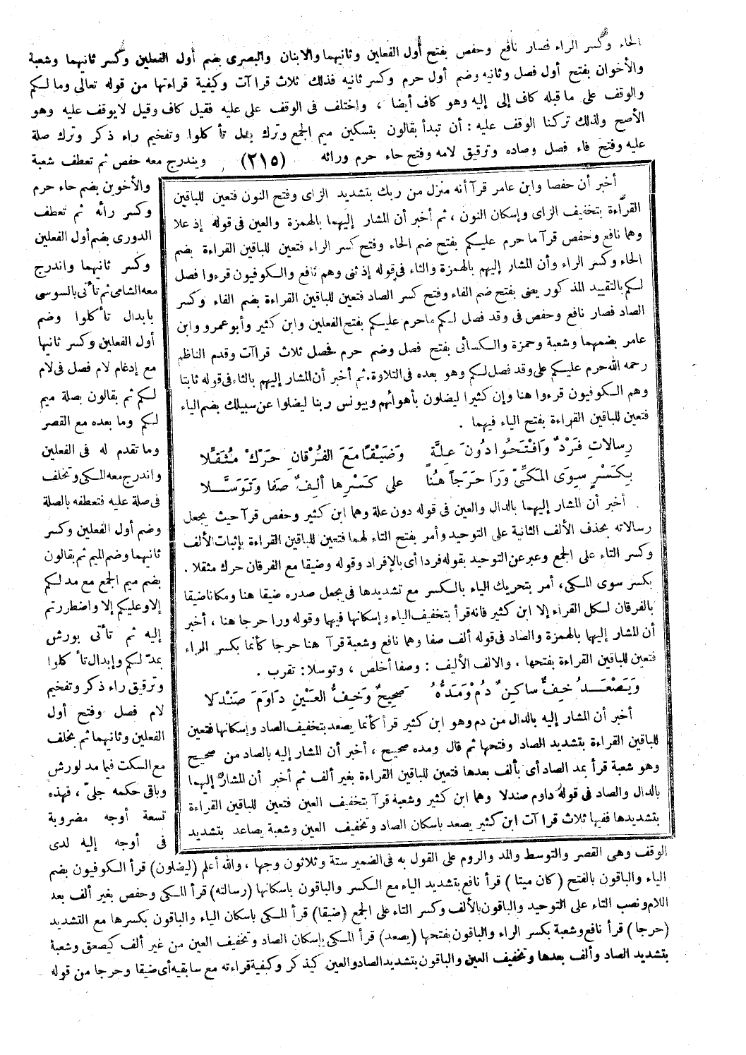 أخبر أن المشار إليهما بالدال والعين في قوله دون علة وهما ابن كثير وحفص قرآ حيث يجعل رسالاته بحذف الألف الثانية على التوحيد وأمر بفتح التاء لهما فتعين للباقين القراءة بإثبات الألف وكسر التاء على الجمع وعبر عن التوحيد بقوله فردا أي بالإفراد وقوله وضيقا مع الفرقان حرك مثقلا. بكسر سوى المكي، أمر بتحريك الياء بالكسر مع تشديدها في يجعل صدره ضيقا هنا ومَكاناً ضَيِّقاً [الفرقان: 13] لكل القراء إلا ابن كثير فإنه قرأ بتخفيف الياء وإسكانها فيهما وقوله ورا حرجا هنا، أخبر أن المشار إليهما بالهمزة والصاد في قوله ألف صفا وهما نافع وشعبة قرآ هنا حرجا كأنما بكسر الراء فتعين للباقين القراءة بفتحها، والألف الأليف: وصفا أخلص، وتوسلا: تقرب.
