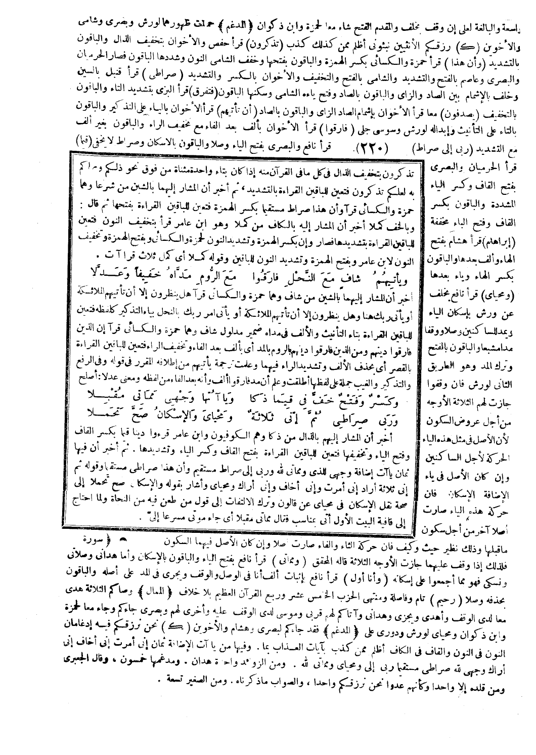 ذلكم وصاكم به لعلكم تذكرون فتعين للباقين القراءة بالتشديد، ثم أخبر أن المشار إليهما بالشين من شرعا وهما حمزة والكسائي قرآ وأن هذا صراط مستقيما بكسر الهمزة فتعين للباقين القراءة بفتحها ثم قال: وبالخف كملا أخبر أن المشار إليه بالكاف من كملا وهو ابن عامر قرأ بتخفيف النون فتعين للباقين القراءة بتشديدها فصار وإن بكسر الهمزة وتشديد النون لحمزة والكسائي وبفتح الهمزة وتخفيف النون لابن عامر وبفتح الهمزة وتشديد النون للباقين وقوله كملا أي كمل ثلاث قراءات.