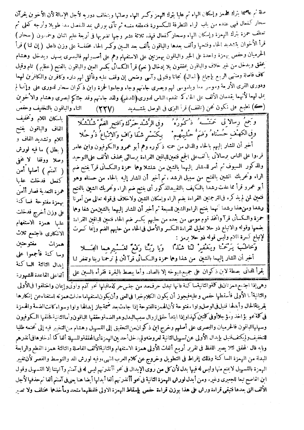 أخبر أن المشار إليهم بالحاء والذال من حمته ذكوره وهم أبو عمرو والكوفيون وابن عامر قرءوا على الناس برسالاتي بألف على الجمع فتعين للباقين القراءة برسالتي بحذف الألف على التوحيد والذكور السيوف ثم أمر للمشار إليهما بالشين من شلشلا وهما حمزة والكسائي قرآ بفتح ضم الراء وتحريك الشين بالفتح من سبيل الرشد، ثم أخبر أن المشار إليه بالحاء من حسناه وهو أبو عمرو قرأ مما علمت رشدا بالكهف بالتقييد المذكور أي بفتح ضم الراء وتحريك الشين بالفتح فتعين لمن لم يذكره في الترجمتين القراءة بضم الراء وإسكان الشين ولا خلاف في قوله تعالى: مِنْ أَمْرِنا رَشَداً، ومن هذا رشدا أنهما بفتح الراء والشين للسبعة ثم أخبر أن المشار إليهما بالشين من شفا وهما حمزة والكسائي قرآ واتخذ قوم موسى من بعده من حليهم بكسر ضم الحاء فتعين للباقين القراءة بضمها وقوله والاتباع ذو حلا تعليل لقراءة الكسر والأصل في الحاء من حليهم الضم وإنما كسرت لاتباع كسرة