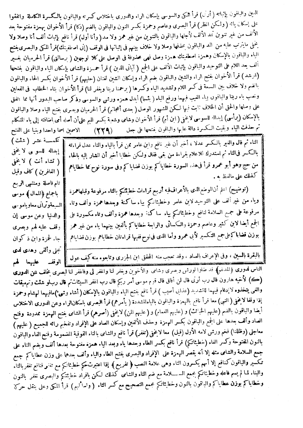 توضيح: اعلم أن الموضع الذي بالأعراف فيه أربع قراءات خطيئتكم بالتاء مرفوعة وقبلها همزة وياء من غير ألف على التوحيد لابن عامر وخطيئاتكم بياء ساكنة وبعدها همزة وألف وتاء مرفوعة على جمع السلامة لنافع وخطيئاتكم بياء ساكنة وبعدها همزة وألف وتاء مكسورة على الجمع أيضا لابن كثير وعاصم وحمزة والكسائي والرابعة خطاياكم بألفين بينهما ياء من غير همز بوزن قضاياكم على جمع التكسير لأبي عمرو وأما الذي في نوح ففيها قراءتان خطاياهم بوزن قضاياهم