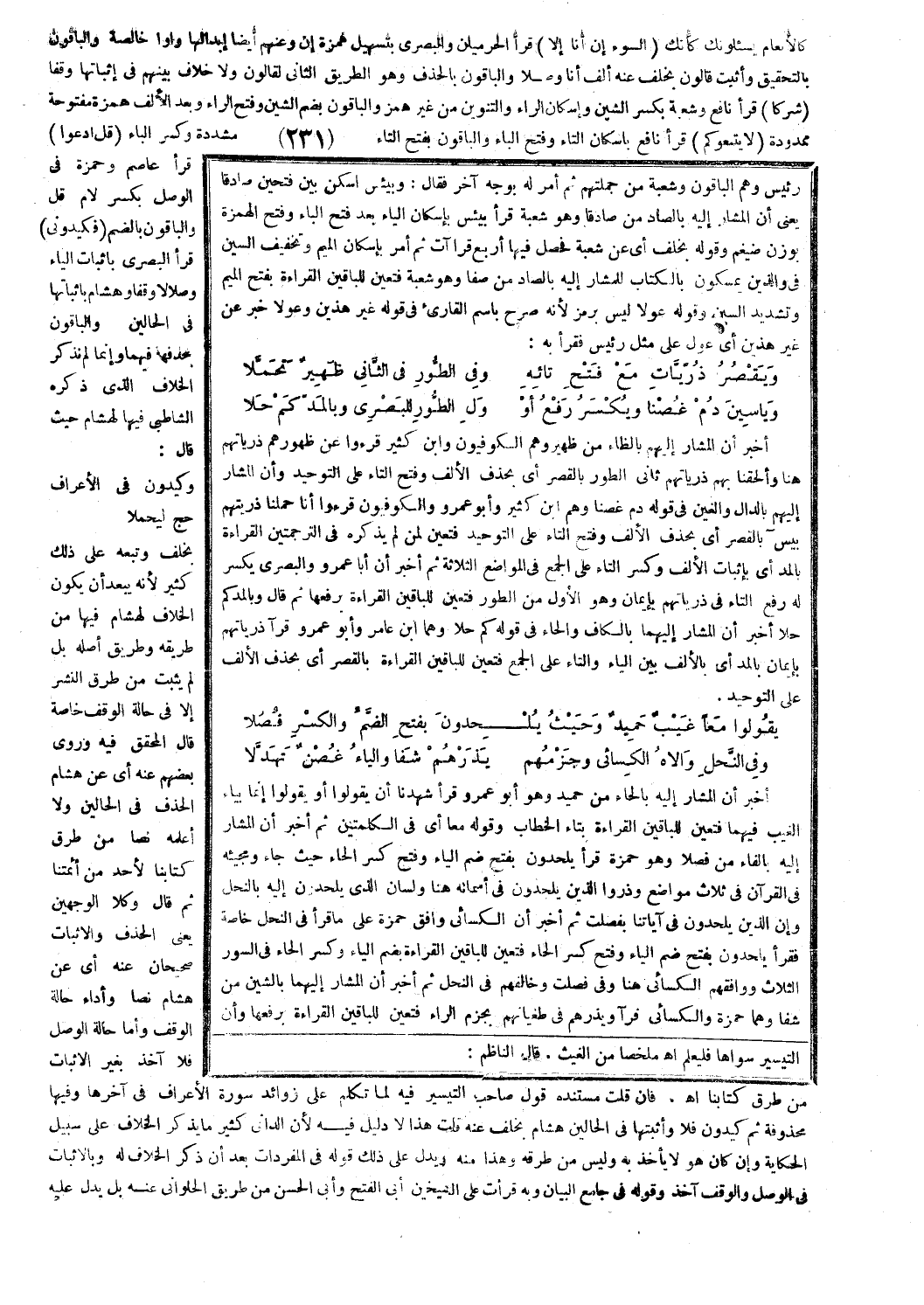 180] هنا ولِسانُ الَّذِي يُلْحِدُونَ إِلَيْهِ [النحل: 103]، وإِنَّ الَّذِينَ يُلْحِدُونَ فِي آياتِنا [فصلت: 40]، ثم أخبر أن الكسائي وافق حمزة على ما قرأ في النحل خاصة فقرأ يلحدون بفتح ضم الياء وفتح كسر الحاء فتعين للباقين القراءة بضم الياء وكسر الحاء في السور الثلاث ووافقهم الكسائي هنا وفي فصلت وخالفهم في النحل، ثم أخبر أن المشار إليهما بالشين من شفا وهما حمزة والكسائي قرآ وَيَذَرُهُمْ فِي طُغْيانِهِمْ [الأعراف: 186] بجزم الراء فتعين للباقين القراءة برفعها وأن
