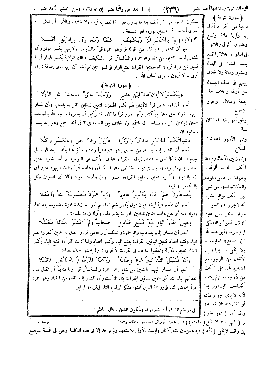 أخبر أن المشار إليهما بالشين من شاع وهما حمزة والكسائي قرآ وما منعهم أن تقبل منهم نفقاتهم بياء التذكير فتعين للباقين القراءة بتاء التأنيث وأن المشار إليه بالفاء من فاقبلا وهو حمزة قرأ بخفض التاء في وَرَحْمَةٌ لِلَّذِينَ آمَنُوا مِنْكُمْ [التوبة: 61] المرفوع التاء في قراءة الباقين.