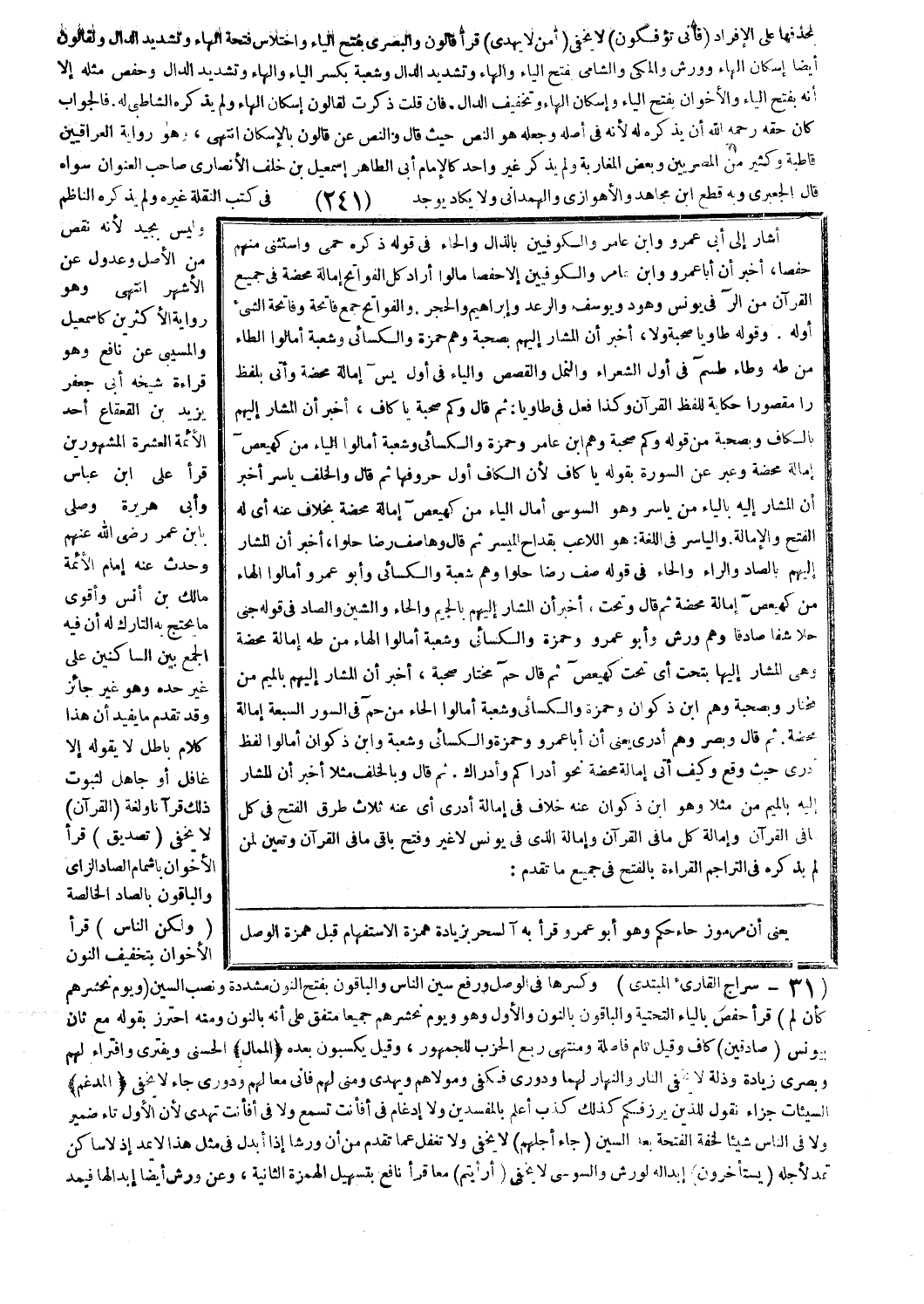 المشار إليه بالياء من ياسر وهو السوسي أمال الياء من كهيعص إمالة محضة بخلاف عنه أي له الفتح والإمالة. والياسر في اللغة: هو اللاعب بقداح الميسر ثم قال وهاصف رضا حلوا، أخبر أن المشار إليهم بالصاد والراء والحاء في قوله صف رضا حلوا وهم شعبة والكسائي وأبو عمرو أمالوا الهاء من كهيعص إمالة محضة ثم قال وتحت، أخبر أن المشار إليهم بالجيم والحاء والشين والصاد في قوله جنى حلا شفا صادقا وهم ورش وأبو عمرو وحمزة والكسائي وشعبة أمالوا الهاء من طه إمالة محضة وهي المشار إليها بتحت أي تحت كهيعص ثم قال حم مختار صحبة، أخبر أن المشار إليهم بالميم من مختار وبصحبة وهم ابن ذكوان وحمزة والكسائي وشعبة أمالوا الحاء من حم في السور السبعة إمالة محضة. ثم قال وبصر وهم أدرى يعني أن أبا عمرو وحمزة والكسائي وشعبة وابن ذكوان أمالوا لفظ أدرى حيث وقع وكيف أتى إمالة محضة نحو أدراكم وأدراك. ثم قال: وبالخلف مثلا أخبر أن المشار إليه بالميم من مثلا وهو ابن ذكوان عنه خلاف في إمالة أدرى أي عنه ثلاث طرق الفتح في كل ما في القرآن وإمالة كل ما في القرآن وإمالة الذي في يونس لا غير وفتح باقي ما في القرآن وتعين لمن لم يذكره في التراجم القراءة بالفتح في جميع ما تقدم: