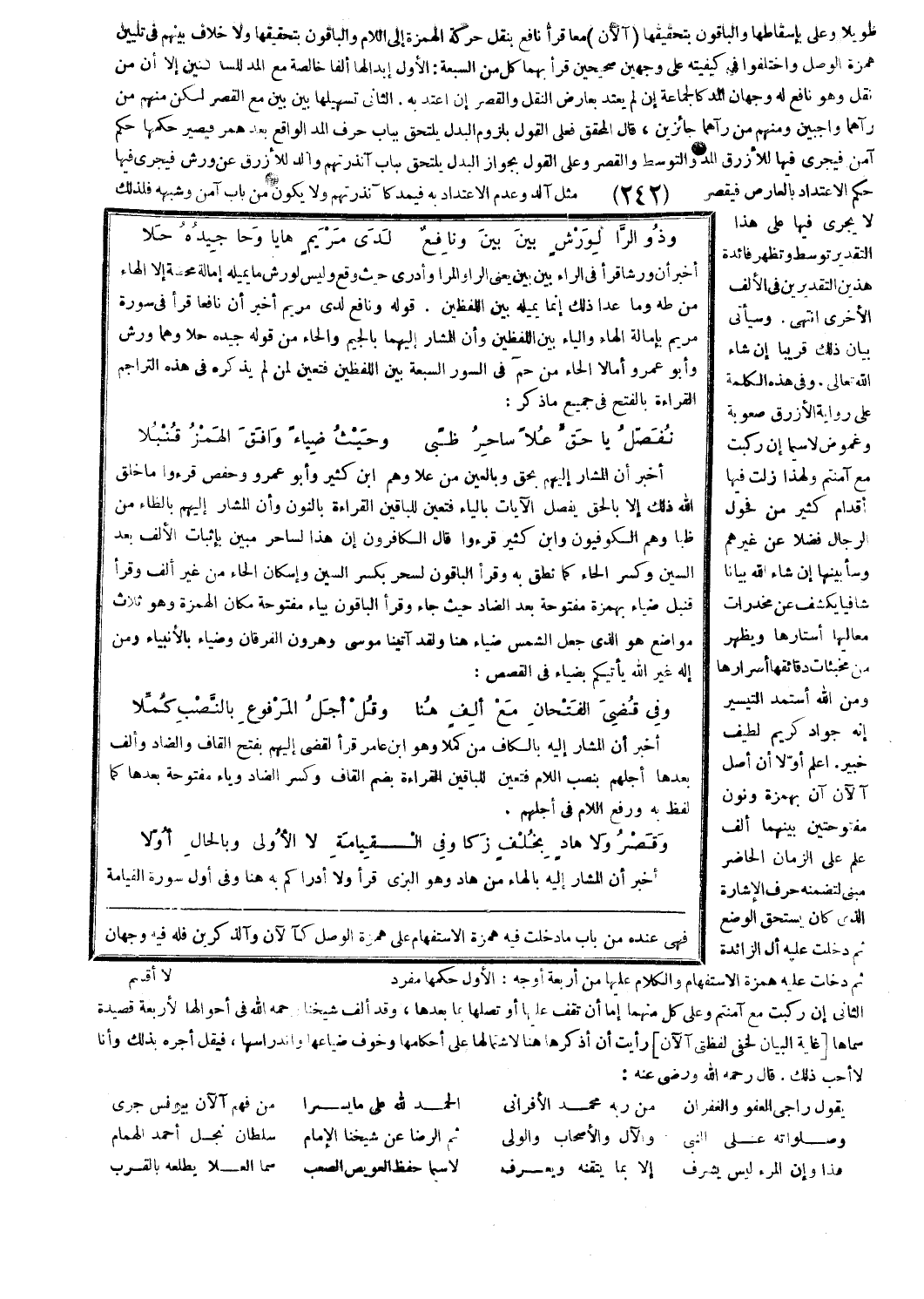 أخبر أن المشار إليهم بحق وبالعين من علا وهم ابن كثير وأبو عمرو وحفص قرءوا ما خَلَقَ اللَّهُ ذلِكَ إِلَّا بِالْحَقِّ [يونس: 5]، يُفَصِّلُ الْآياتِ [يونس: 5] بالياء فتعين للباقين القراءة بالنون وأن المشار إليهم بالظاء من ظبا وهم الكوفيون وابن كثير قرءوا قالَ الْكافِرُونَ إِنَّ هذا لَساحِرٌ مُبِينٌ [الأنبياء: 48]، بإثبات الألف بعد السين وكسر الحاء كما نطق به وقرأ الباقون لَسِحْرٌ [يونس: 76] بكسر السين وإسكان الحاء من غير ألف وقرأ قنبل ضياء بهمزة مفتوحة بعد الضاد حيث جاء وقرأ الباقون بياء مفتوحة مكان الهمزة وهو ثلاث مواضع وهُوَ الَّذِي جَعَلَ الشَّمْسَ ضِياءً [يونس: 5]، هنا وَلَقَدْ آتَيْنا مُوسى وَهارُونَ الْفُرْقانَ [الأنبياء: 48]، وَضِياءً [الأنبياء: 48]، مَنْ إِلهٌ غَيْرُ اللَّهِ يَأْتِيكُمْ بِضِياءٍ [القصص: 71].