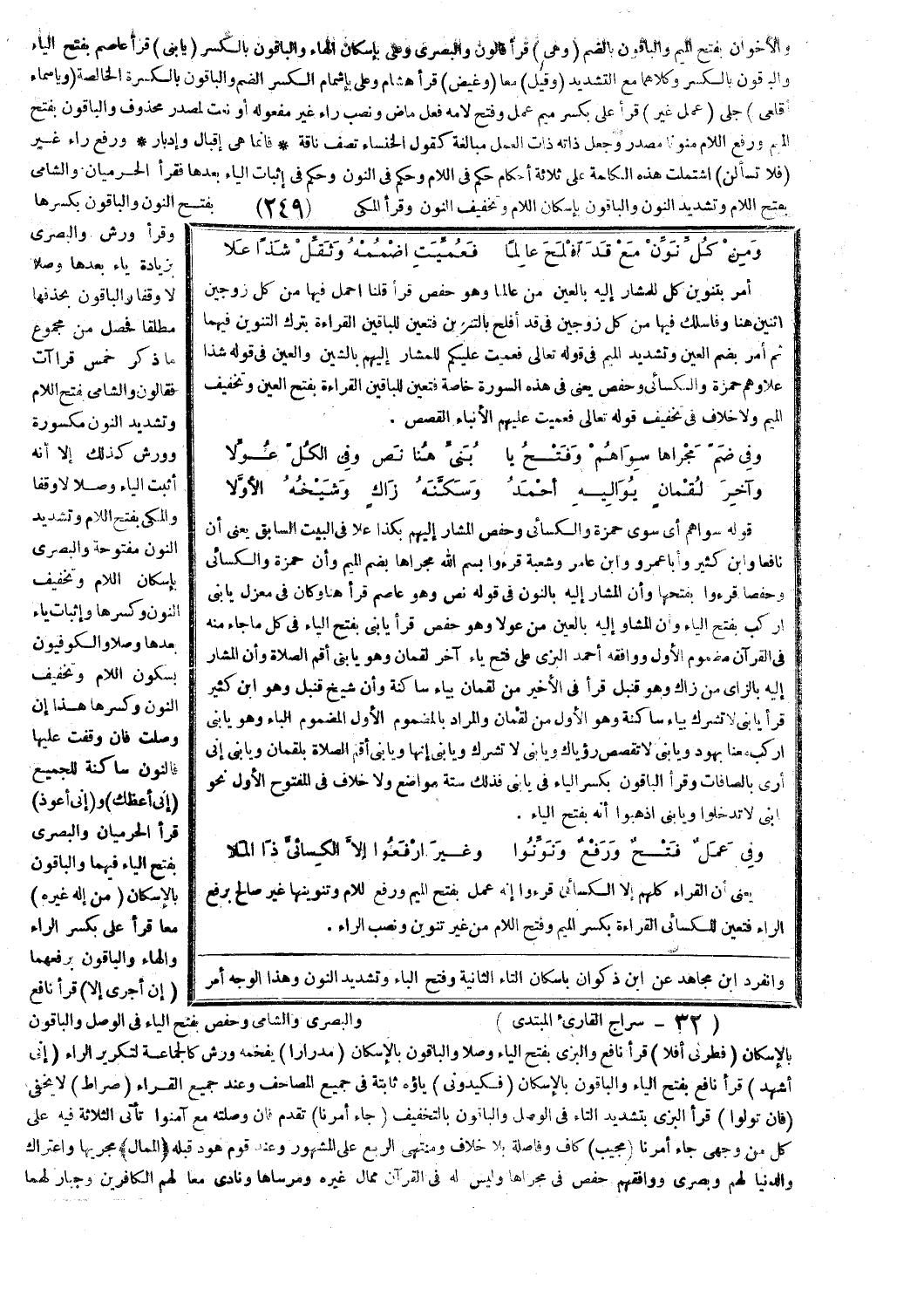 أمر بتنوين كل للمشار إليه بالعين من عالما وهو حفص قرأ قُلْنَا احْمِلْ فِيها مِنْ كُلٍّ زَوْجَيْنِ اثْنَيْنِ [هود: 40]، هنا وفَاسْلُكْ فِيها مِنْ كُلٍّ زَوْجَيْنِ [المؤمنون: 27]، في قد أفلح بالتنوين فتعين للباقين القراءة بترك التنوين فيهما ثم أمر بضم العين وتشديد الميم في قوله تعالى: فَعُمِّيَتْ عَلَيْكُمْ [هود: 80]، للمشار إليهم بالشين والعين في قوله: شذا علا وهم حمزة والكسائي وحفص يعني في هذه السورة خاصة فتعين للباقين القراءة بفتح العين وتخفيف الميم ولا خلاف في تخفيف قوله تعالى: فَعَمِيَتْ عَلَيْهِمُ الْأَنْباءُ [القصص: