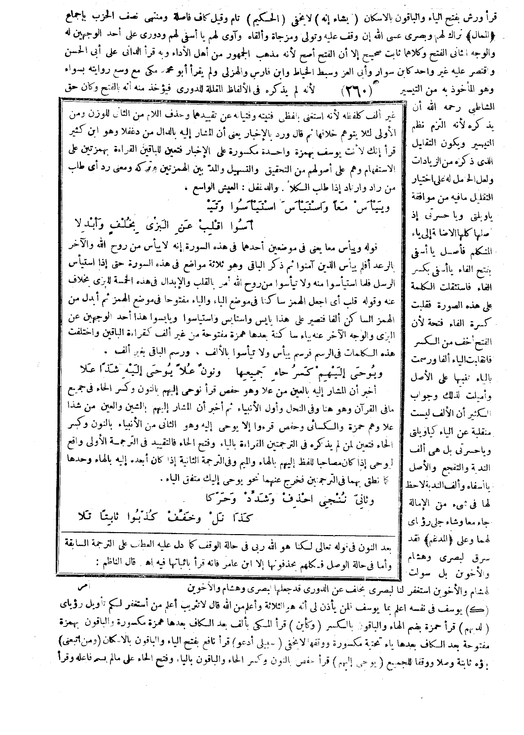 بالشين والعين من شذا علا وهم حمزة والكسائي وحفص قرءوا إلا يوحى إليه وهو الثاني من الأنبياء بالنون وكسر الحاء فتعين لمن لم يذكره في الترجمتين القراءة بالياء وفتح الحاء فالتقييد في الترجمة الأولى واقع ليوحى إذا كان مصاحبا للفظ إليهم بالهاء والميم وفي الترجمة الثانية إذا كان أبعده إليه بالهاء وحدها كما نطق بهما في الترجمتين فخرج عنهما نحو يوحى إليك متفق الياء.