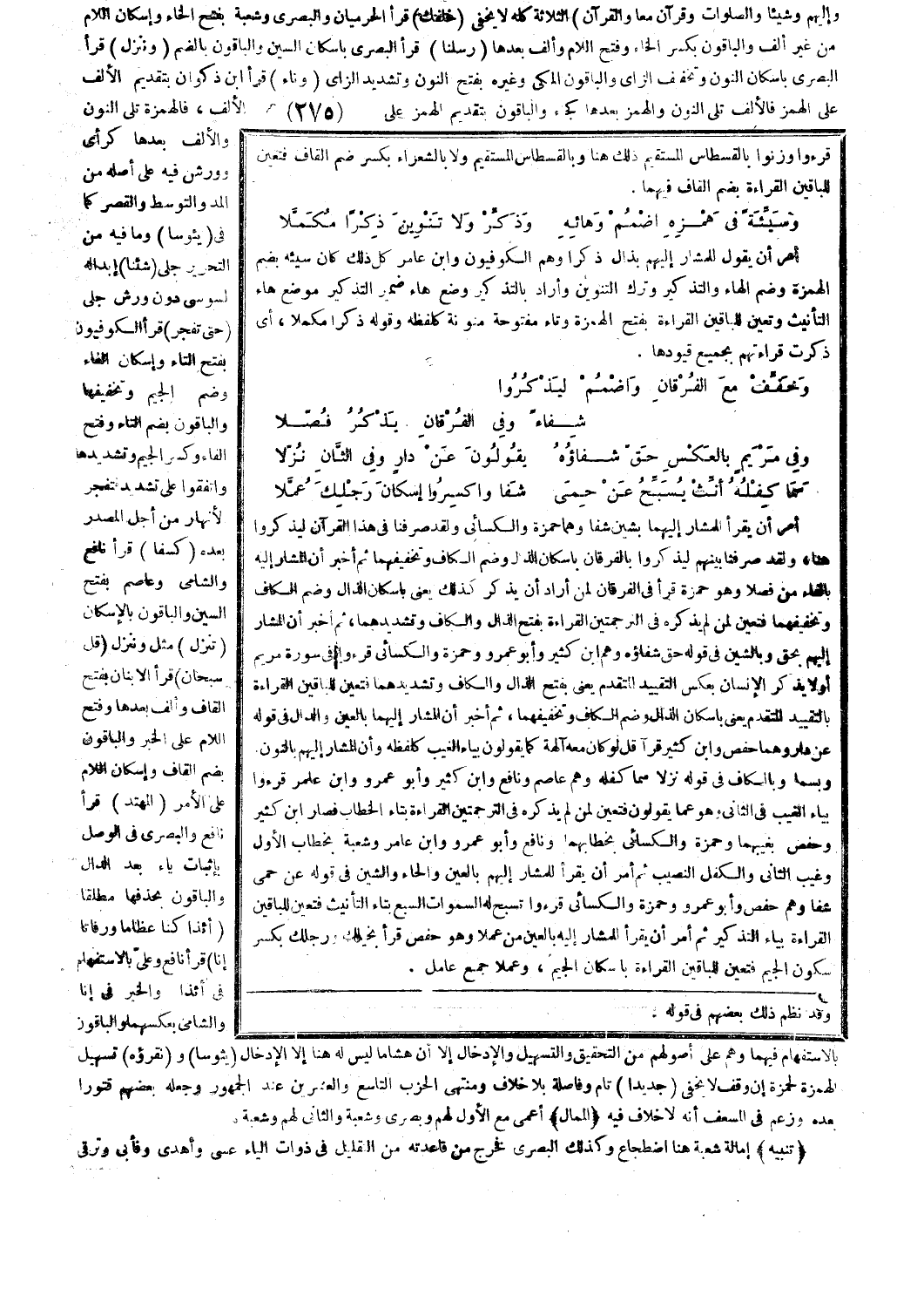 أمر أن يقرأ للمشار إليهما بشين شفا وهما حمزة والكسائي، وَلَقَدْ صَرَّفْنا فِي هذَا الْقُرْآنِ لِيَذَّكَّرُوا [الإسراء: 41] هنا، وَلَقَدْ صَرَّفْناهُ بَيْنَهُمْ لِيَذَّكَّرُوا [الفرقان: 50] بإسكان الذال وضم الكاف وتخفيفهما ثم أخبر أن المشار إليه بالفاء من فصلا وهو حمزة قرأ في الفرقان لِمَنْ أَرادَ أَنْ يَذَّكَّرَ [الفرقان: 62]، كذلك يعني بإسكان الذال وضم الكاف وتخفيفهما فتعين لمن لم يذكره في الترجمتين القراءة بفتح الذال والكاف وتشديدهما، ثم أخبر أن المشار إليهم بحق وبالشين في قوله حق شفاؤه وهم ابن كثير وأبو عمرو وحمزة والكسائي قرءوا في سورة مريم أَوَلا يَذْكُرُ الْإِنْسانُ [مريم: 97] بعكس التقييد المتقدم يعني بفتح الذال والكاف وتشديدهما فتعين للباقين القراءة بالتقييد المتقدم يعني بإسكان الذال وضم الكاف وتخفيفهما، ثم أخبر أن المشار إليهما بالعين والدال في قوله عن دار وهما حفص وابن كثير قرآ قل لو كان معه آلهة كما يقولون بياء الغيب كلفظه وأن المشار إليهم بالنون. وبسما وبالكاف في قوله نزلا سما كفله وهم عاصم ونافع وابن كثير وأبو عمرو وابن عامر قرءوا بياء الغيب في الثاني وهو عما يقولون فتعين لمن لم يذكره في الترجمتين القراءة بتاء الخطاب فصار ابن كثير وحفص بغيبهما وحمزة والكسائي بخطابهما ونافع وأبو