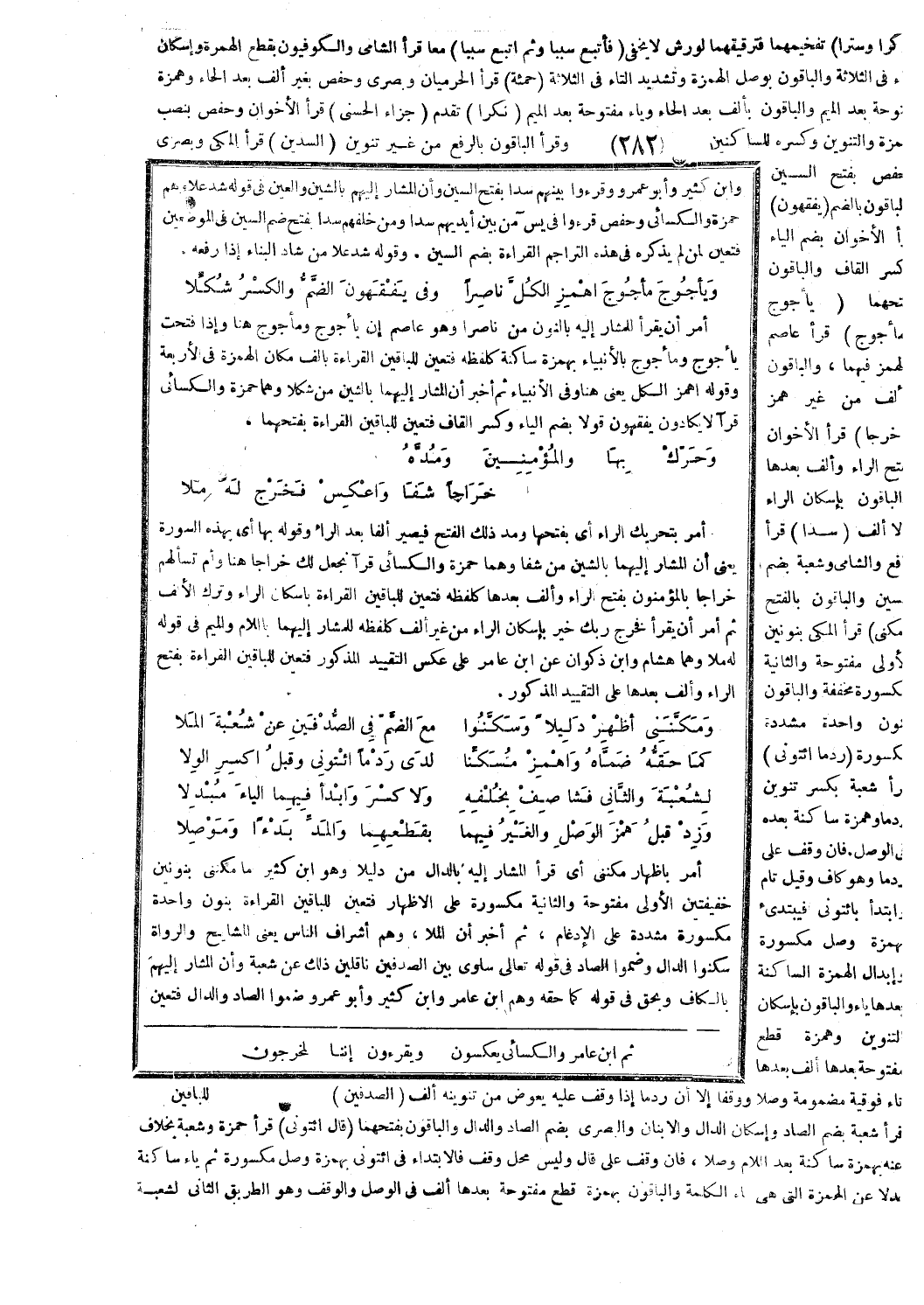 أمر أن يقرأ للمشار إليه بالنون من ناصرا وهم عاصم إن يأجوج ومأجوج هنا وإِذا فُتِحَتْ يَأْجُوجُ وَمَأْجُوجُ [الأنبياء: 96] بهمزة ساكنة كلفظه فتعين للباقين القراءة بألف مكان الهمزة في الأربعة، وقوله: اهمز الكل يعني هنا وفي الأنبياء ثم أخبر أن المشار إليهما بالشين من شكلا وهما حمزة والكسائي قرآ لا يَكادُونَ يَفْقَهُونَ قَوْلًا [الكهف: 93] بضم الياء وكسر القاف فتعين للباقين القراءة بفتحهما.
