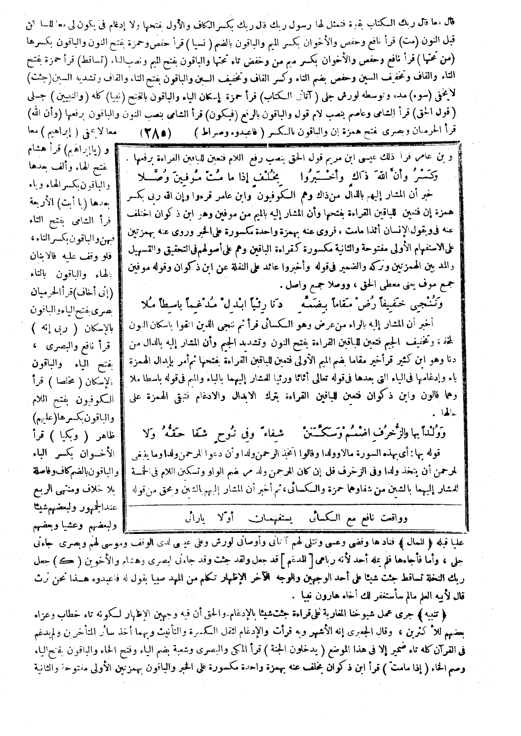 أخبر أن المشار إليه بالراء من عرض وهو الكسائي قرأ ثُمَّ نُنَجِّي الَّذِينَ اتَّقَوْا [مريم: 72] بإسكان النون المخففة وتخفيف الجيم فتعين للباقين القراءة بفتح النون وتشديد الجيم وأن المشار إليه بالدال من دنا وهو ابن كثير قرأ خَيْرٌ مَقاماً [مريم: 73] بضم الميم الأولى فتعين للباقين القراءة بفتحها ثم أمر بإبدال الهمزة ياء وإدغامها في الياء التي بعدها في قوله تعالى: أَثاثاً و (رئيا) للمشار إليهما بالياء والميم في قوله: باسطا ملا وهما قالون وابن ذكوان فتعين للباقين القراءة بترك الإبدال والإدغام فتبقى الهمزة على حالها.