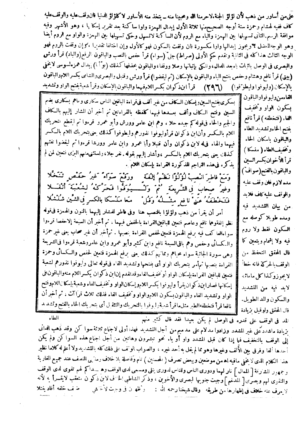 أمر أن يقرأ من ذهب ولؤلؤا بالنصب هنا وفي فاطر للمشار إليهما بالنون والهمزة في قوله: نظم إلفة وهما نافع وعاصم فتعين للباقين القراءة بالخفض فيهما. ثم أخبر أن السبعة إلا حفصا قرءوا سَواءً الْعاكِفُ فِيهِ [الحج: 25] برفع الهمزة فتعين لحفص القراءة بنصبها. ثم أخبر أن غير صحاب يعني غير حمزة والكسائي وحفص وهم باقي السبعة نافع وابن كثير وأبو عمرو وابن عامر وشعبة قرءوا في الشريعة وهي سورة الجاثية سَواءً مَحْياهُمْ وَمَماتُهُمْ [الجاثية: 21] كذلك يعني برفع الهمزة فتعين لحفص والكسائي وحمزة القراءة بنصبها ثم أمر بتحريك الواو أي بفتحها وتشديد الفاء في قوله تعالى: وَلْيُوفُوا نُذُورَهُمْ لشعبة فتعين للباقين القراءة بإسكان الواو أو تخفيف الفاء، وقد تقدم أن ابن ذكوان بكسر اللام منه والباقون على إسكانها فصار ابن ذكوان يقرأ وَلْيُوفُوا بكسر اللام وإسكان الواو وتخفيف الفاء وشعبة بإسكان اللام وفتح الواو وتشديد الفاء والباقون بسكون اللام والواو وتخفيف الفاء فذلك ثلاث قراءات. ثم أخبر أن نافعا قرأ فَتَخْطَفُهُ الطَّيْرُ [الحج: 31] مثل ما قرأ شعبة وَلْيُوفُوا بالتحريك والتثقيل أي بتحريك الخاء بالفتح وتشديد