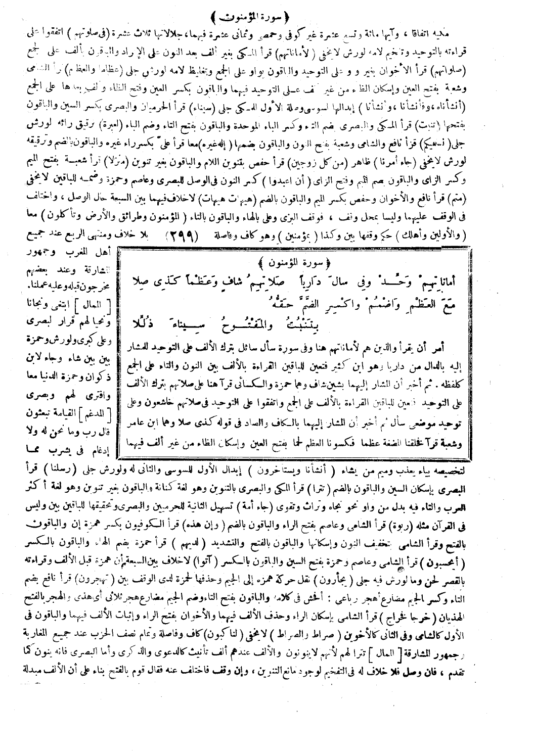 أمر أن يقرأ وَالَّذِينَ هُمْ لِأَماناتِهِمْ [المؤمنون: 8] هنا وفي سورة سأل سائل بترك الألف على التوحيد للمشار إليه بالدال من داريا وهو ابن كثير فتعين للباقين القراءة بالألف بين النون والتاء على الجمع كلفظه. ثم أخبر أن المشار إليهما بشين شاف وهما حمزة والكسائي قرآ هنا على صلاتهم بترك الألف على التوحيد فتعين للباقين القراءة بالألف على الجمع واتفقوا على التوحيد في صلاتهم خاشعون وعلى توحيد موضعي سأل، ثم أخبر أن المشار إليهما بالكاف والصاد في قوله: كذي صلا وهما ابن عامر وشعبة قرآ فَخَلَقْنَا الْمُضْغَةَ عِظاماً [المؤمنون: 15]، فَكَسَوْنَا الْعِظامَ لَحْماً [المؤمنون: 14] بفتح العين وإسكان الظاء من غير ألف فيهما